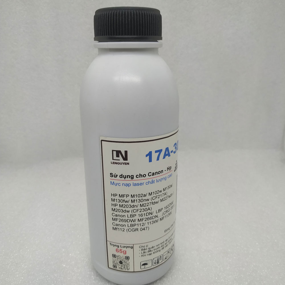 Mực nạp LN 17A 30A 105g (Gồm 65g mực và 40g chai nhựa) Loại mực: laser trắng đen (Mực bột) Mã: 17A-30A Thương hiệu: LN Dùng cho hộp mực: CF217A/ CF230A/ CF233A/ 051/ 047 Dùng