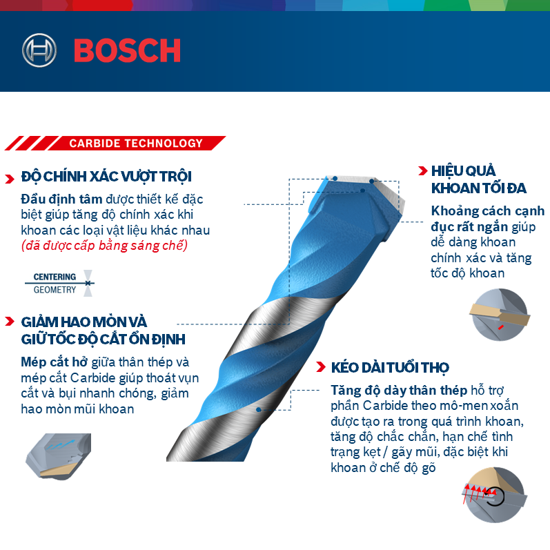 Hiệu quả khoan tối đa: Khoảng cách cạnh đục rất ngắn giúp dễ dàng khoan chính xác và tăng tốc độ khoan. Giảm hao mòn và giữ tốc độ cắt ổn định: Mép cắt hở giữa thân thép và mép cắt Carbide giúp thoát vụn cắt và bụi nhanh chóng, giảm hao mòn mũi khoan.