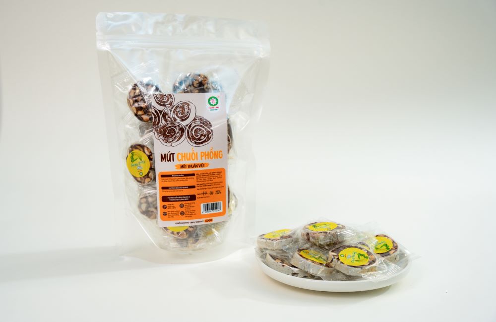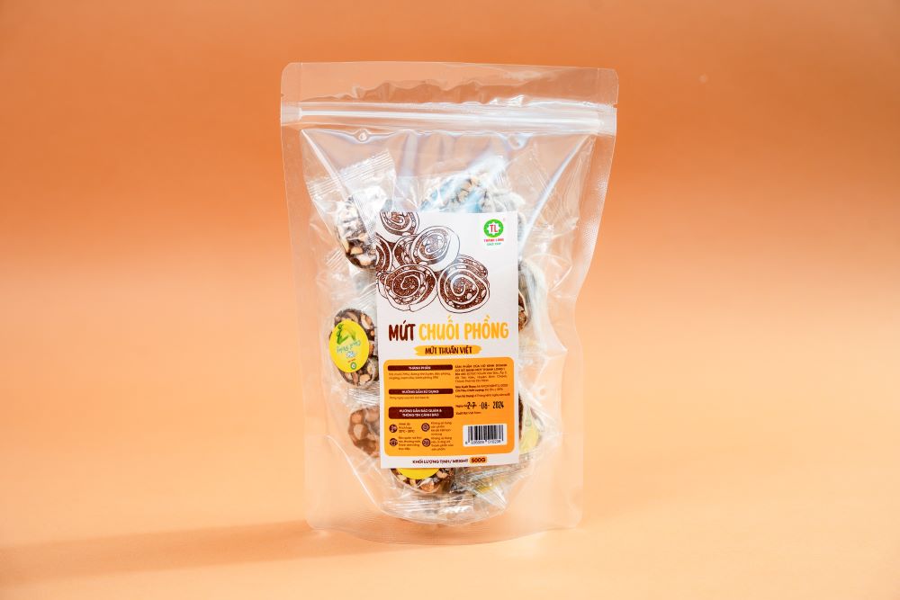 SẢN PHẨM CỦA HỘ KINH DOANH CƠ SỞ BÁNH MỨT THÀNH LONG 1 MỨT CHUỐI PHỒNG MỨT THUẦN VIỆT THÀNH PHẦN: Trái chuối (70%), đường tinh luyện, đậu phộng, củ gừng, mạch nha, bánh phồng SẢN XUẤT THEO: 54/HKDCSBMTL1/2021 THỜI HẠN SỬ DỤNG : 06 Tháng kể từ ngày sản xuất CHỈ TIÊU CHẤT LƯỢNG : ĐỘ ẨM ≤ 35% HƯỚNG DẪN SỬ DỤNG VÀ BẢO QUẢN: HƯỚNG DẪN BẢO QUẢN: BẢO QUẢN NƠI KHÔ RÁO, THOÁNG MÁT. TRÁNH ÁNH NẮNG TRỰC TIẾP. NHIỆT ĐỘ THÍCH HỢP: 22 ĐỘ C-30 ĐỘ C HƯỚNG DẪN SỬ DỤNG: DÙNG NGAY SAU KHI MỞ BAO BÌ. THÔNG TIN CẢNH BÁO: KHÔNG SỬ DỤNG SẢN PHẨM KHI ĐÃ HẾT HẠN SỬ DỤNG GIẤY CHỨNG NHẬN HACCP SỐ 21.4256 – HACCP/VC DO TRUNG TÂM GIÁM ĐỊNH VÀ CHỨNG NHẬN HỢP CHUẨN HỢP QUY - VIETCERT ĐÁNH GIÁ CHỨNG NHẬN PHÙ HỢP TIÊU CHUẨN Chi tiết mẫu mã bao bì sản phẩm thay đổi theo từng lô hàng.