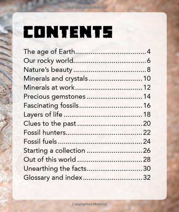 Pack up your gear and get ready to go on a dig. Whether it's iron ore, dazzling gemstones, or a prehistoric creature preserved in amber, exciting discoveries await budding paleontologists and geologists in this informative book. Large and detailed full-color spreads, complemented by clear, concise text unearth the mysteries of rocks, crystals, minerals, and fossils--how they are formed, where they are found, and how they are used. Includes an illustrated glossary and an index to sharpen the young reader's reference skills.