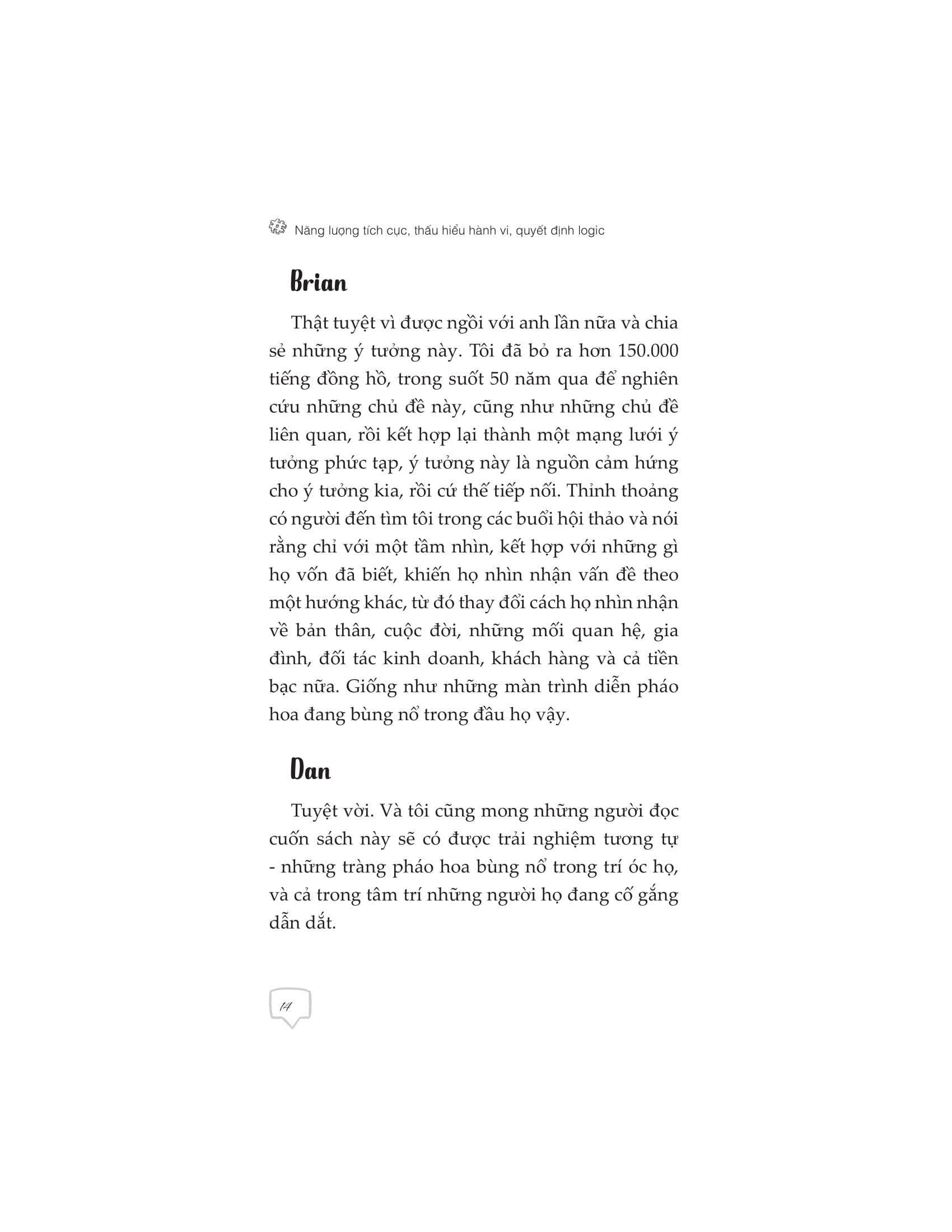 “Năng lượng tích cực, thấu hiểu hành vi, quyết định logic” sẽ giúp bạn hiểu cụ thể hơn về những quy tắc và các bước quan trọng trong việc biến kỹ năng gây ảnh hưởng trở thành thói quen trong cách suy nghĩ cũng như hành động, giúp bạn mở ra cánh cửa thành công trong sự nghiệp và cuộc sống.
