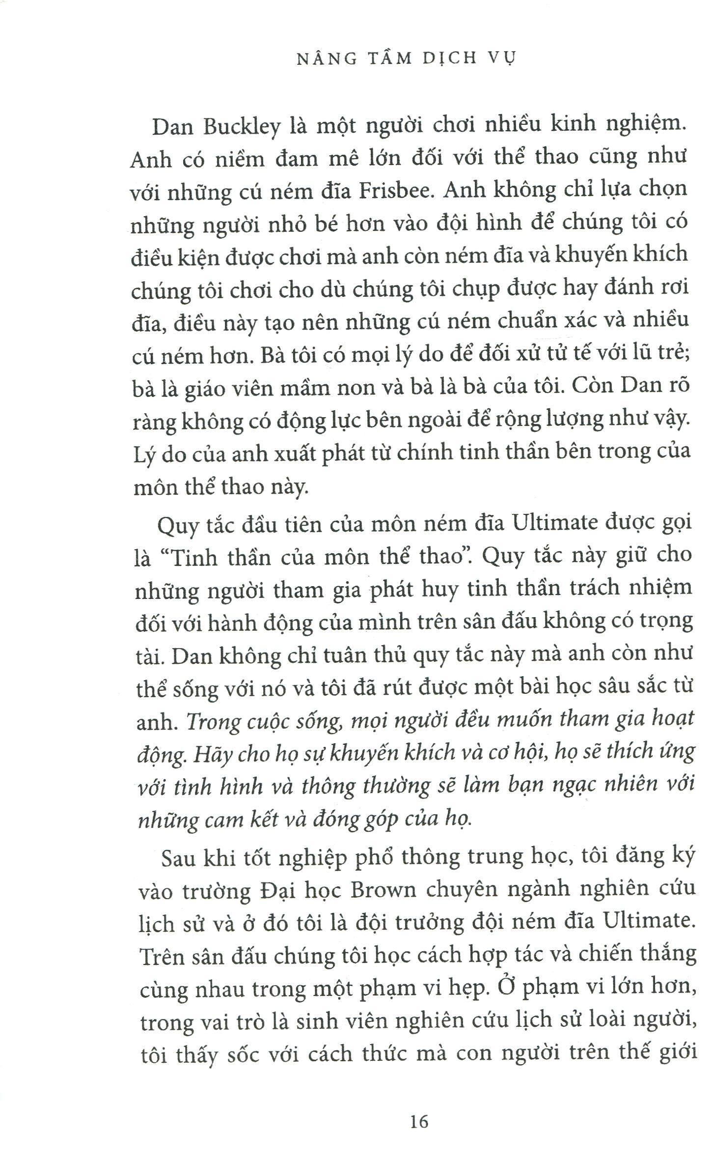 Mua tại TiktokCuốn sách tiết lộ sức mạnh của việc cung cấp dịch vụ nâng tầm và các bước đi mà người làm dịch vụ có thể áp dụng nhằm xây dựng văn hóa dịch vụ bền vững, có thể phát huy hiệu quả hàng ngày. Cuốn sách cũng trả lời rất nhiều câu hỏi về quá trình thúc đẩy dịch vụ liên tục và xóa đi những quan niệm sai lầm về dịch vụ. Cuốn sách sẽ làm nổi bật lên các công ty và những con người luôn đặt ưu tiên vào sự phục vụ, và có được những thành quả và danh tiếng tuyệt vời. Cuốn sách đưa ra những vấn đề cốt yếu cần thiết để bắt đầu thúc đẩy tổ chức kinh doanh dịch vụ – và tầm nhìn của lãnh đạo kinh doanh dịch vụ.