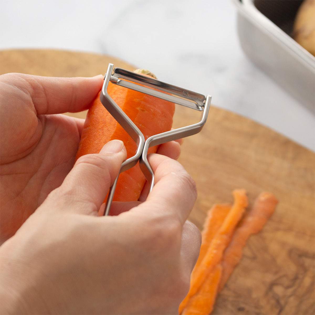 Nâng cao quá trình chuẩn bị lột da của bạn. Dụng cụ gọt vỏ nhiều lưỡi, hai trong một của chúng tôi cung cấp cả lưỡi thẳng và lưỡi Julienne mà bạn chỉ cần chọn