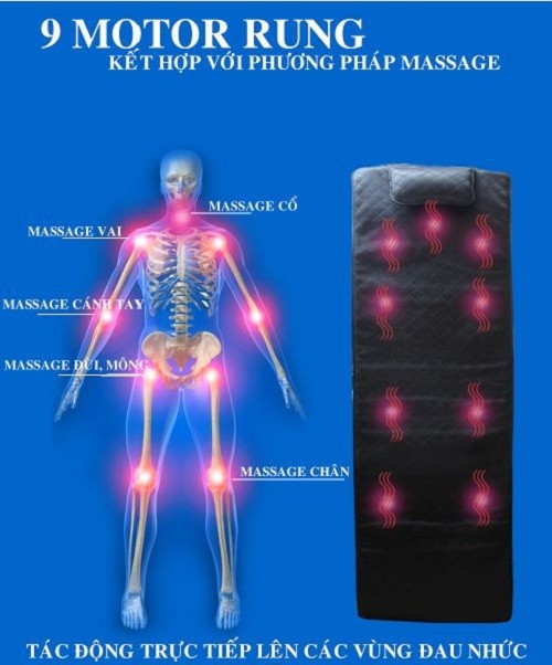 Những vấn đề này sẽ được giải quyết khi bạn sử dụng Nệm Massage Toàn Thân. Sản phẩm với thiết kế cao cấp, chất liệu bền bỉ, 9 động cơ motor cao cấp, đặc biệt còn kết hợp với nhiệt hồng ngoại giúp người dùng massage giảm đau nhức cơ thể, giải tỏa căng thẳng mệt mỏi, stress trong công việc một cách hiệu quả.