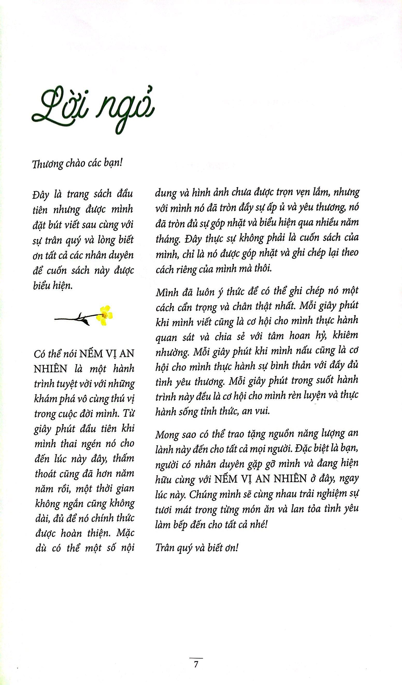 Mong sao có thể trao tặng nguồn năng lượng an lành này đến cho tất cả mọi người. Đặc biệt là bạn, người có nhân duyên gặp gỡ mình và đang hiện hữu cùng với NẾM VỊ AN NHIÊN ở đây, ngay lúc này. Chúng mình sẽ cùng nhau trải nghiệm sự tươi mát trong từng món ăn và lan tỏa tình yêu làm bếp đến cho tất cả nhé!”