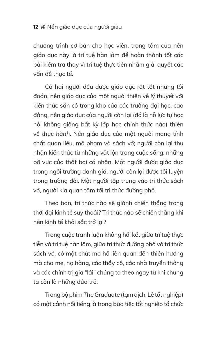 Bạn sẽ thấy được điều đó khi đọc Nền giáo dục của người giàu của Michael Ellsberg. Tác giả đã phỏng vấn các tỉ phú và triệu phú không có bằng đại học, bao gồm ông trùm thời trang Russell Simmons, chủ tịch đồng sáng lập ok Sean P Bên cạnh đó, Michael Ellsberg còn đưa ra những chỉ dẫn tuyệt vời để bạn tiến tới thành công bằng những kỹ năng vô cùng đơn giản: Để tìm được người hướng dẫn, cách tạo hứng thú trong công việc, cách xây dựng phong cách cá nhân và nhiều hơn thế nữa.