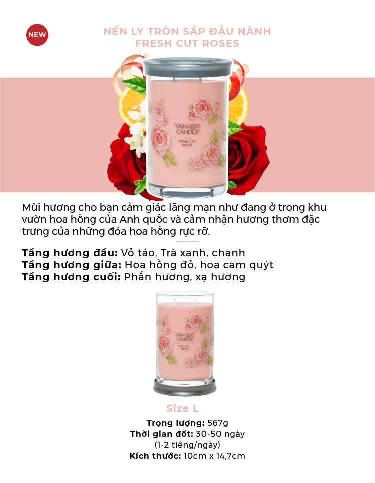 ✨Nến ly tròn sáp đậu nành Yankee Candle size L (567g) - Fresh Cut Roses