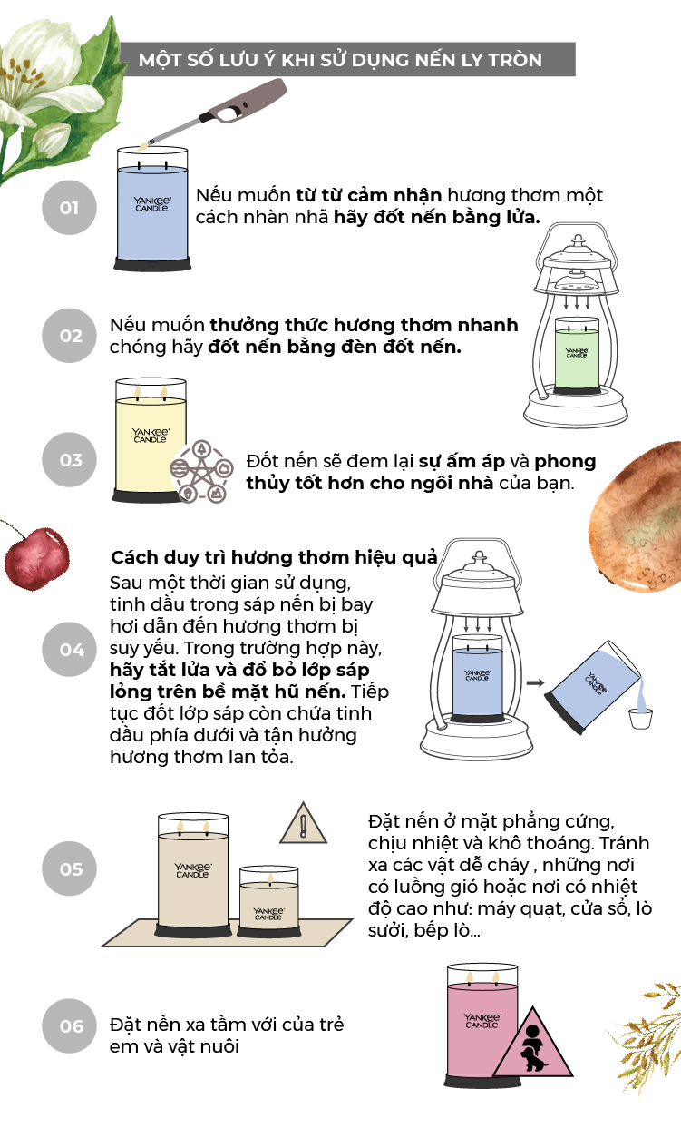 Kích thước (D x R x C cm): 8 x 8 x 10.5 Thời gian cháy: 35 giờ Được làm bằng sáp cao cấp và an toàn Ánh sáng dịu nhẹ, lãng mạn, hương thơm