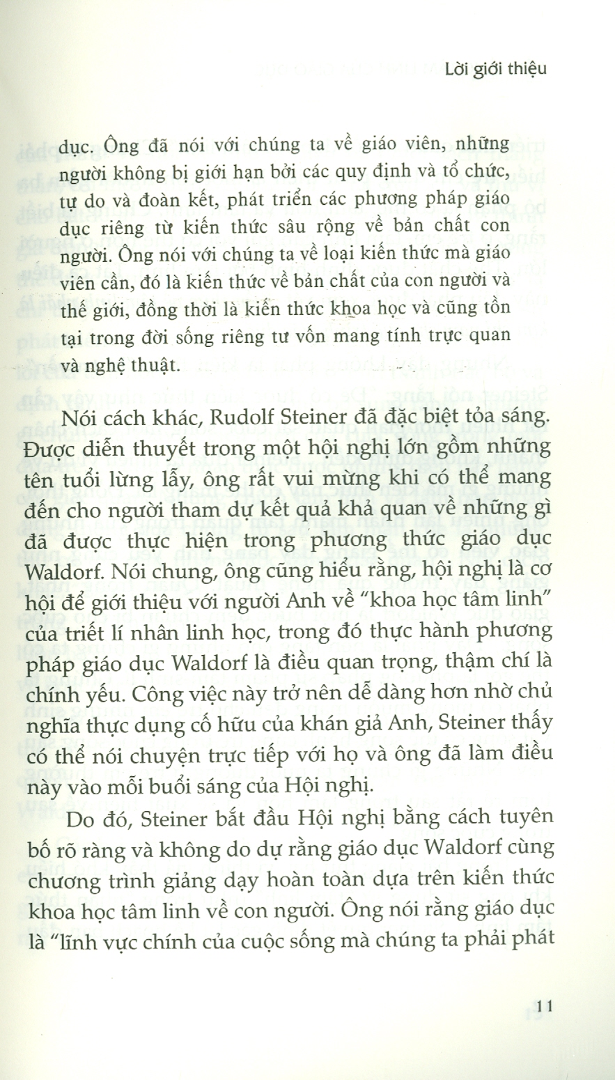 - Tác phẩm Nền tảng tâm linh của giáo dục là một trong những bài giảng xuất sắc của Rudolf Steiner về phương pháp giáo dục Waldorf vì có cái nhìn rộng rãi, sâu sắc, táo bạo và có khả năng tiếp cận cao. Bài giảng được đưa ra năm 1922 tại Đại học Mansfield, Oxford, Anh và thính giả là những người danh tiếng nhất mà Steiner từng thuyết giảng. Đó là hội nghị về “Giá trị tâm linh trong giáo dục và đời sống xã hội” với khoảng 200 người tham dự. Tiến sĩ Millicent Mackenzie, sau này là Giáo sư Giáo dục tại thành phố Cardiff (Wales) - người mà Steiner rất kính trọng - giữ vai trò chủ tọa trong các bài giảng. Bộ trưởng Bộ Lao động, Tiến sĩ H. A. L. Fisher chịu trách nhiệm điều khiển Hội nghị. Các diễn giả khác là những tên tuổi nổi tiếng như học giả cổ điển vĩ đại Gilbert Murray, nhà văn A. Clutton Brock, Giáo sư Maxwell Garnett và Edward Holmes. “Giáo viên cần có tâm trí cởi mở, sẵn sàng đón nhận kiến thức mới mỗi ngày và khuynh hướng có thể biến đổi tri thức tích lũy thành tiềm lực giúp tâm trí luôn rộng mở đón nhận cái mới. Điều này giúp con người khỏe mạnh, trẻ trung và năng động. Một trái tim cởi mở đón nhận những thay đổi trong cuộc sống - sự mới mẻ bất ngờ và tiếp diễn của cuộc sống - phải là bản chất và tâm tính cơ bản của một giáo viên trường Waldorf”.