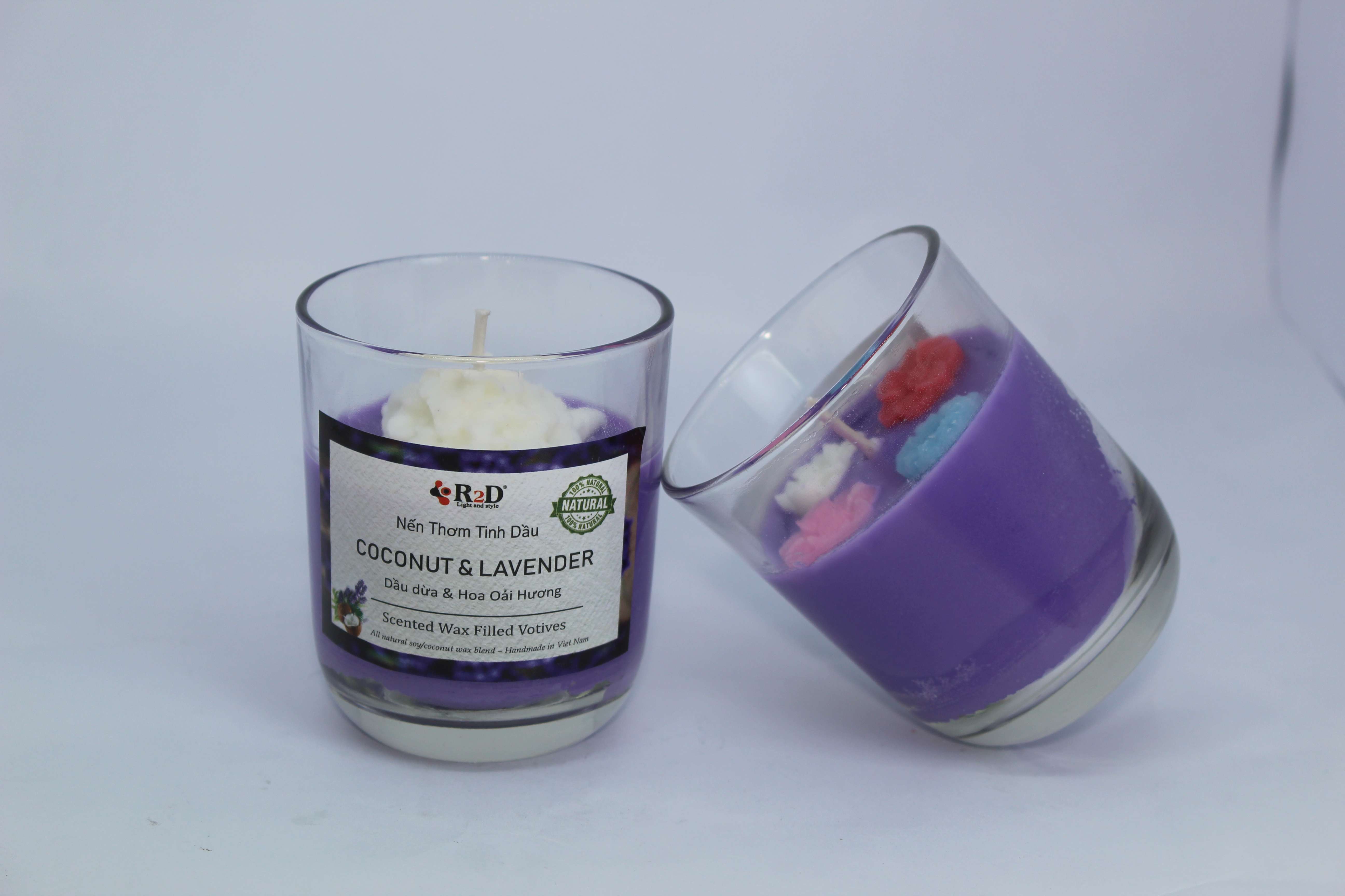 Nến Thơm, Tinh Dầu Coconut-Lavender, Nến Thư Giãn [Ly 300g], Đến Từ Shop R2D, Thành Phần Tự Nhiên, Lành Tính.      - Ngày nay, con người càng chú trọng đến không gian sống. Một không gian thoáng mát, tràn ngập hương thơm sẽ đem lại cho bạn một trải nghiệm thư giãn, thoải mái, giảm căng thẳng sau một ngày dài làm việc. Vì vậy, nến thơm khuếch tán mùi hương luôn là sự lựa chọn hoàn hảo cho bạn.      - Tinh dầu LAVENDER  có tác dụng xoa dịu thần kinh, giảm lo lắng, hỗ trợ điều trị chứng rối lọan lo âu tạm thời, cải thiện cảm xúc.      - Đối với nữ: Tinh dầu LAVENDER có thể giúp làm dịu các triệu chứng cảm xúc tiền kinh nguyệt, mệt mỏi, căng thẳng. Thành phần: Dầu cọ, dầu dừa, tinh dầu vanila Định lượng: 300g (khối lượng tịnh). Kích thước: Ly (8.5x7.0cm) Thời gian đốt: 28 giờ trong điều kiện phù hợp.                                                                                    - Nến thơm tinh dầu coconut & lavender được làm  từ nguyên liệu thiên nhiên như sáp cọ, sáp đậu nành, dầu dừa và tinh dầu lavender. Sản phẩm an toàn với môi trường, không khói khi đốt, lành tính cho người sử dụng.      - Nếu bạn đang tìm một hương thơm dễ chịu, thoải mái cho không gian làm việc, thư giãn của mình thì không nên bỏ qua hương thơm vừa mạnh mẽ, vừa dịu nhẹ và ngọt ngào của nến thơm tinh dầu coconut & lavender. HƯỚNG DẪN SỬ DỤNG: Sản phẩm đốt trực tiếp. LƯU Ý KHI SỬ DỤNG SẢN PHẨM THƠM TINH DẦU R2D.