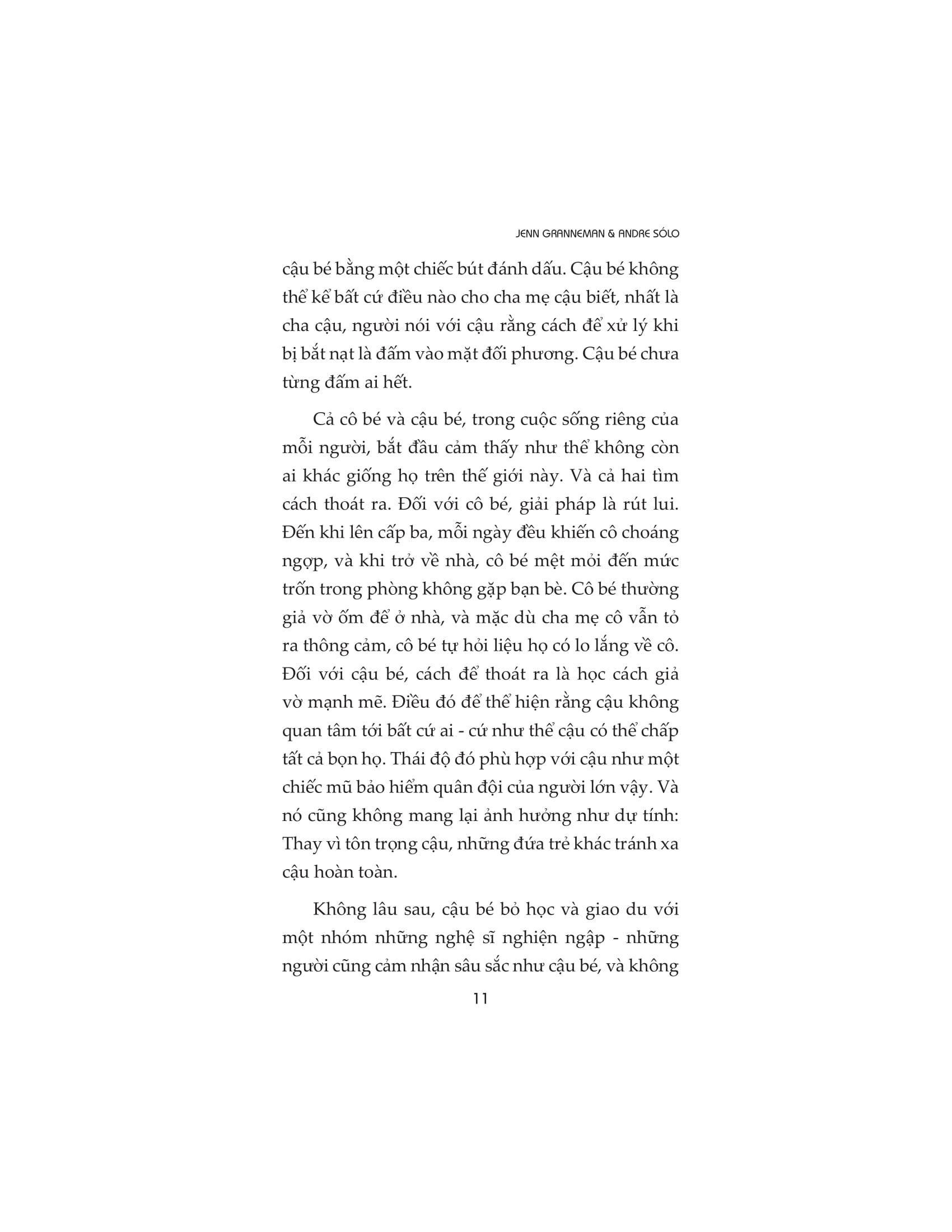Người nhạy cảm đều có quyền lựa chọn con đường riêng của họ. Nhưng có một bước mà tất cả chúng ta đều phải thực hiện và nó là bước khó khăn nhất: ngưng nhìn nhận sự nhạy cảm là một khiếm khuyết và bắt đầu coi nó là một món quà. Cuốn sách chứa đầy cảm hứng này sẽ thay đổi mãi mãi cách chúng ta nhìn nhận những người nhạy cảm và cách họ nhìn nhận chính m.ình.