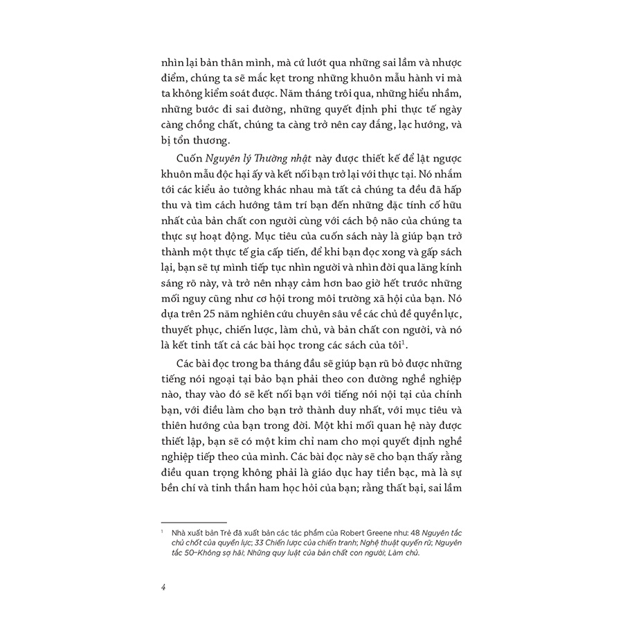Cuốn Nguyên Lý Thường Nhật là bộ sưu tập 366 suy ngẫm chiến lược, mỗi ngày một trang, giúp bạn tiếp nhận từng chút thông thái đúc kết từ quyền lực, sự quyến rũ, cách làm chủ bản thân, chiến lược đến bản chất con người.
