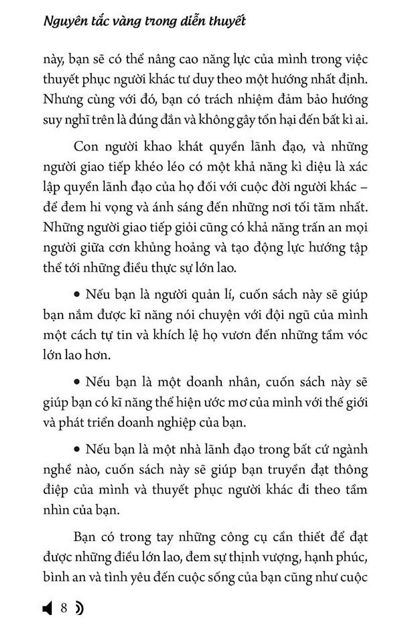 Cuốn sách này có thể giúp bạn cải thiện rất nhiều về kĩ năng giao tiếp, và nó có tác động trực tiếp đến vận mệnh của bạn trên các phương diện tinh thần, cảm xúc, sự nghiệp và tài chính. Hãy tưởng tượng bạn có thể tự tin hơn trong bất cứ tình huống nào mà bạn cần trình bày lí lẽ: thuyết phục một nhân vật quan trọng, bộc lộ cảm xúc, bán sản phẩm, đàm phán, đề nghị tăng lương hay tham gia phỏng vấn để có được công việc mơ ước.Kì thực, những nguyên tắc trong sách có thể và nên được sử dụng mỗi khi bạn giao tiếp, dù ở chốn công cộng hay bất kì nơi nào. Những kĩ năng giúp bạn trở thành một người giao tiếp tự tin hơn trước đám đông cũng chính là những kĩ năng bạn nên áp dụng khi nói chuyện riêng với người khác.