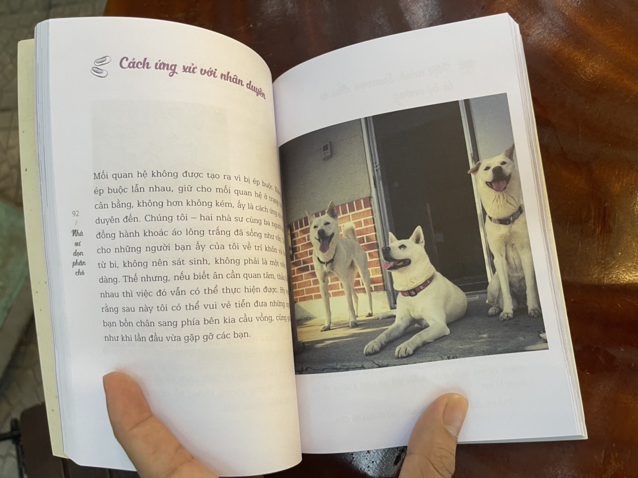 Một bé bốn tuổi vẫn còn đi chưa vững, lấy đá ném vào chú chó bé nhỏ hơn mình. Tại sao bé lại làm như vậy? Bên cạnh, một bé khác lên tiếng ngăn cản bạn. Vậy lúc đó, em bé này đã nghĩ sao? Một bé vốn nghĩ chó chỉ là loài động vật hôi hám, ánh mắt chợt sáng lấp lánh khi nhìn thấy các bạn chó làm việc cho con người. Bé ấy đã cảm thấy điều gì nhỉ? Một bé mỉm cười rạng rỡ khi vuốt ve bộ lông mềm mượt của một chú chó dẫn đường. Tôi thành thật hy vọng các bé có thể trưởng thành và tỏa sáng trong mỗi phút giây như vậy. Đồng hành cùng tôi và các bé là ba chú chó trắng, chó dẫn đường, chó nghiệp vụ của trang trại sản xuất thực phẩm cho chó và cha mẹ, ông bà của các bé – những người đang hoan nghênh, cổ vũ các em cũng như nỗ lực của các cô giáo ở trường mầm non. Tôi có chút e ngại vì sợ năng lực viết nghèo nàn của mình không thể nào truyền tải được toàn bộ những câu chuyện tuyệt vời về trẻ em và động vật. Dù vậy, tôi vẫn hy vọng bạn đọc có thể bỏ qua những thành kiến sẵn có về sách do nhà sư viết, và cảm nhận trọn vẹn tâm hồn đẹp đẽ của trẻ em cũng như sự đáng yêu của những người bạn bốn chân thông qua cuốn sách này.