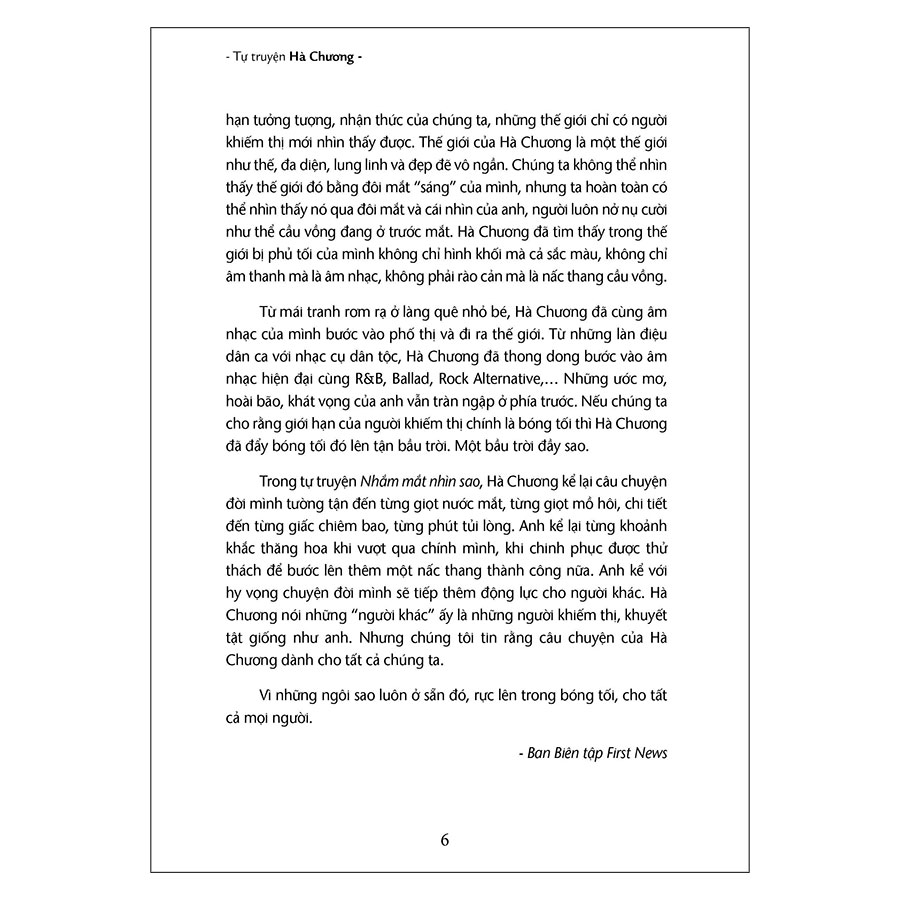 Đây là tự chuyện về cuộc đời của anh - người nhạc sĩ khiếm thị sáng tác và hát qua lăng kính của ánh sáng không màu. Trong tự truyện Nhắm Mắt Nhìn Sao, Hà Chương kể lại câu chuyện đời mình tường tận đến từng giọt nước mắt, từng giọt mồ hôi, chi tiết đến từng giấc chiêm bao, từng phút tủi lòng. Anh kể lại từng khoảnh khắc thăng hoa khi vượt qua chính mình, khi chinh phục được thử thách để bước lên thêm một nấc thang thành công nữa. Anh kể với hy vọng chuyện đời mình sẽ tiếp thêm động lực cho người khác.
