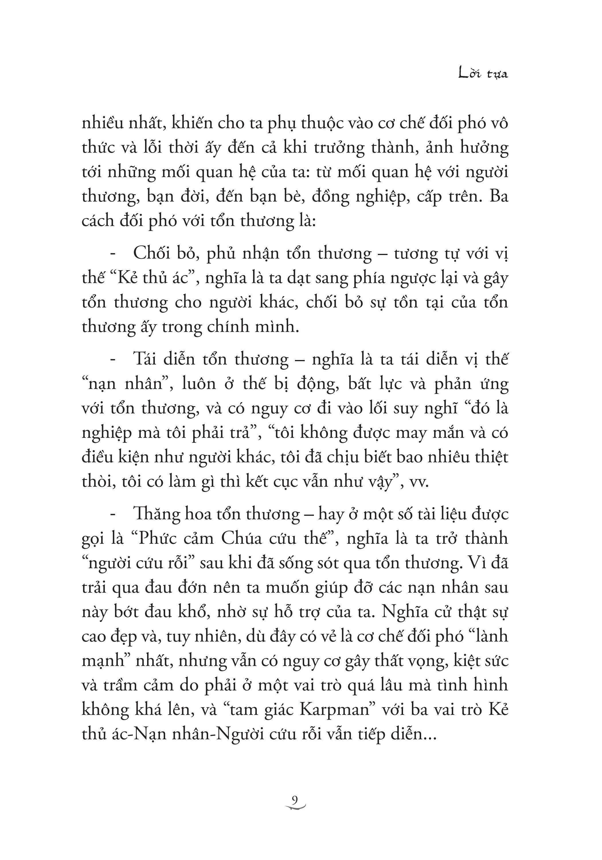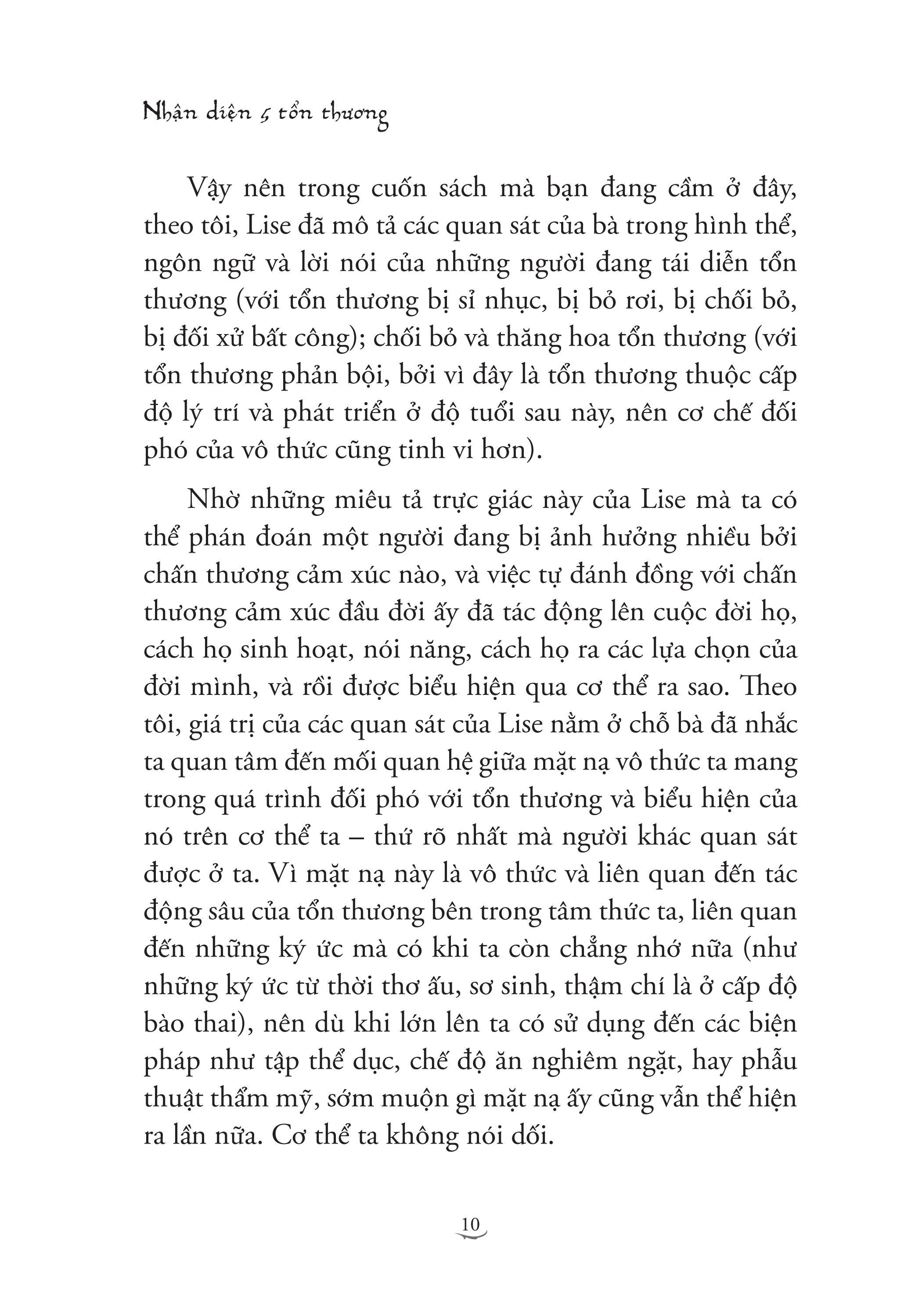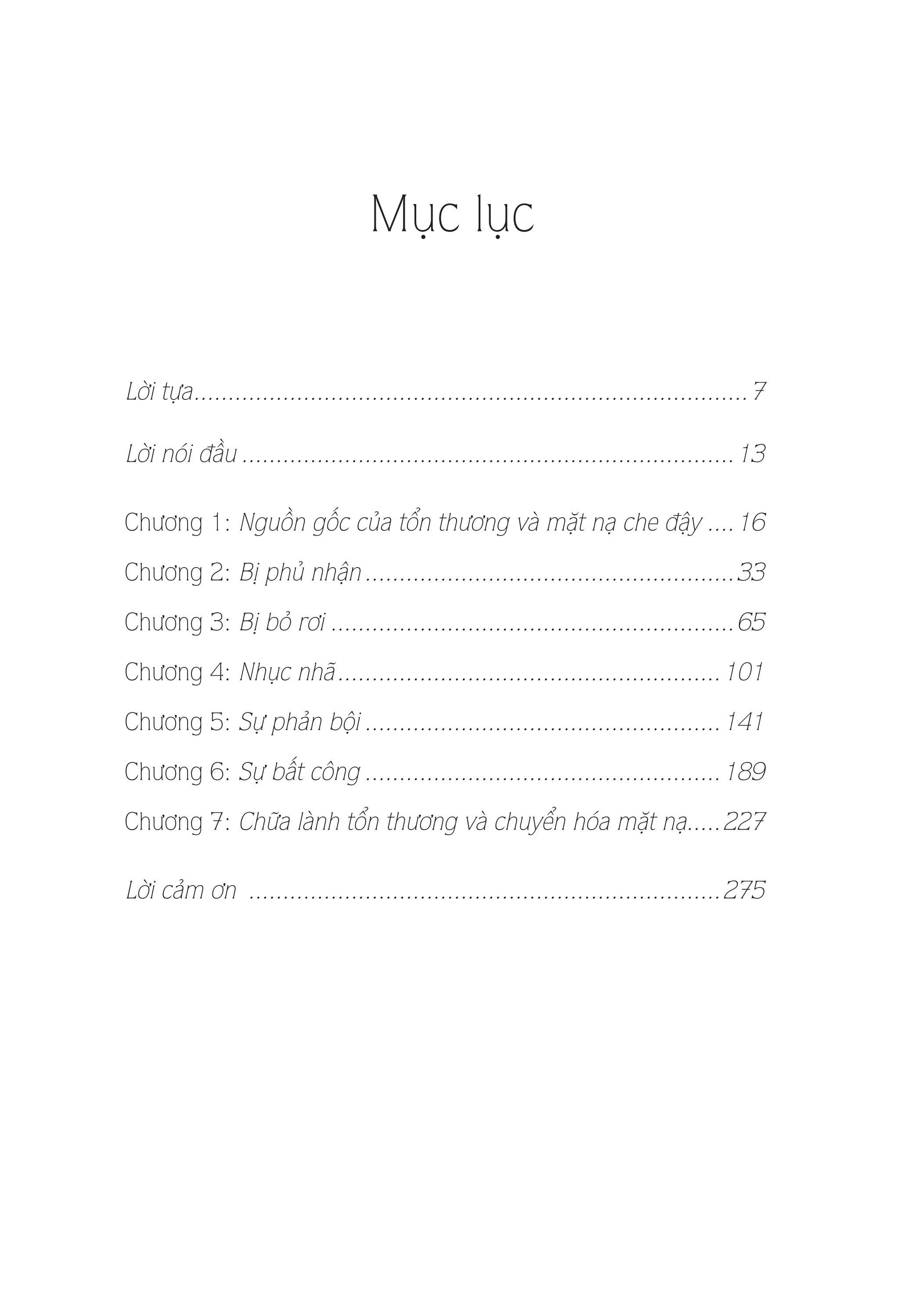 Nhận Diện 5 Tổn Thương GIỚI THIỆU SÁCH: Cuốn sách mô tả những quan sát của tác giả trong hình thể, ngôn ngữ và lời nói của những người đang tái diễn tổn thương (với tổn thương nhục nhã, bị bỏ rơi, bị phủ nhận, bị phản bội, bị đối xử bất công). Nhờ những miêu tả trực giác này của tác giả mà chúng ta có thể phán đoán được một người đang bị ảnh hưởng nhiều bởi chấn thương cảm xúc nào, và việc tự đánh đồng chấn thương cảm xúc đầu đời ấy đã tác động lên cuộc đời họ, cách họ sinh hoạt, nói năng, cách họ đưa ra các lựa chọn của đời m.ình, và rồi được biểu hiện qua cơ thể ra sao. Qua những tổn thương đó, chúng ta thấy được mối quan hệ giữa mặt nạ vô thức ta mang trong quá trình đối phó với những tổn thương và biểu hiện của chúng trên cơ thể ta. Thông qua cuốn sách, chúng ta dần thấu hiểu tâm thức của con người và có thể rút ra được bài học cho chính m.ình trên hành trình “thành nhân” (theo cách nói của Carl Rogers) hay “thành toàn tự ngã” (theo cách nói của Carl Jung) của mỗi chúng ta. TÁC GIẢ: Lise Bourbeau là tác giả nổi tiếng toàn cầu, bà đã viết 20 cuốn sách, trong đó có nhiều đầu sách best-seller về chủ đề lắng nghe cơ thể và nhận diện những tổn thương bên trong. Sách của bà được dịch ra gần 20 ngôn ngữ trên thế giới. Từ khi thành lập trường phái nghiên cứu của m.ình vào năm 1982, những tư tưởng của bà đã giúp đỡ rất nhiều người cải thiện chất lượng cuộc sống và tạo ra những thay đổi bền vững hàng ngày. Lắng nghe cơ thể bạn, trường phái phát triển bản thân có sức ảnh hưởng lớn nhất ở Quebec, đã được truyền bá trong các buổi hội thảo trên hơn 20 quốc gia và trong 10 thứ ngôn ngữ. Bộ sách “Nhận diện 5 tổn thương” và “Chữa lành 5 tổn thương” là hai trong số rất nhiều đầu sách best-seller của bà. TRÍCH ĐOẠN SÁCH HAY: Khi một đứa trẻ được sinh ra, tự trong sâu thẳm nó đã biết lý do vì sao nó đầu thai. Đó chính là được làm chính m.ình trong khi sống qua rất nhiều trải nghiệm. Vả lại, linh hồn nó đã chọn gia đình và hoàn cảnh sống để sinh ra cùng với một mục tiêu rất cụ thể. Tất cả chúng ta đều có một nhiệm vụ giống nhau khi đến với Trái đất này: trải nghiệm cuộc sống cho đến khi nào chúng ta chấp nhận nó và trong quá trình đó yêu thương lấy m.ình. Chừng nào chúng ta còn chưa chấp nhận một trải nghiệm nào đó, tức là vẫn còn phán xét nó, vẫn còn dằn vặt vì nó, sợ hãi, tiếc nuối nó, hay mọi dạng không chấp nhận khác, chừng đó con người ta còn không ngừng thu hút vào m.ình những hoàn cảnh, sự kiện và con người đẩy ta quay trở lại với trải nghiệm đó một lần nữa. Một số người, không chỉ gặp cùng một trải nghiệm nhiều lần trong đời, mà còn phải đầu thai một hay nhiều lần nữa thì mới có thể hoàn toàn chấp nhận nó. Chấp nhận một trải nghiệm nào đó không có nghĩa là chúng ta mong muốn có nó hay đồng tình với nó, mà đúng hơn là cho phép ta cảm thụ và học hỏi từ những gì ta đã trải qua. Đặc biệt chúng ta phải học cách nhận ra cái gì là có ích cho m.ình, cái gì là không. Cách duy nhất để nhận ra điều đó là trở nên ý thức về hậu quả của mỗi trải nghiệm. Tất cả những gì mà ta đã lựa chọn hoặc không lựa chọn, tất cả những gì mà ta đã làm hoặc không làm, tất cả những gì mà ta đã nói hoặc không nói và thậm chí tất cả những gì ta đã nghĩ và không nghĩ, đã cảm và không cảm đều để lại hậu quả. Trước khi đi vào miêu tả các giai đoạn chữa lành cho mỗi loại tổn thương và mặt nạ ngụy trang, tôi xin được chia sẻ với các bạn những quan sát liên quan tới cung cách đi đứng, nằm ngồi, nhảy mú của những người thuộc từng loại tổn thương. Điều này sẽ làm rõ sự khác nhau về hành vi của các mặt nạ. Tùy theo mặt nạ mà cách nói chuyện và giọng nói của người ta sẽ khác: