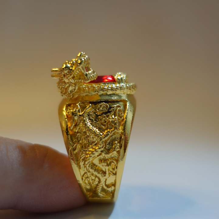 Chất liệu Thân Nhẫn: Hợp kim Titanium Chất liệu đá: Đá Zircon nhân tạo, kiểu dáng kim cương Thiết kế: Khắc rồng trên thân và mặt nhẫn, tinh xảo, chi tiết. Công dụng: Trang sức,