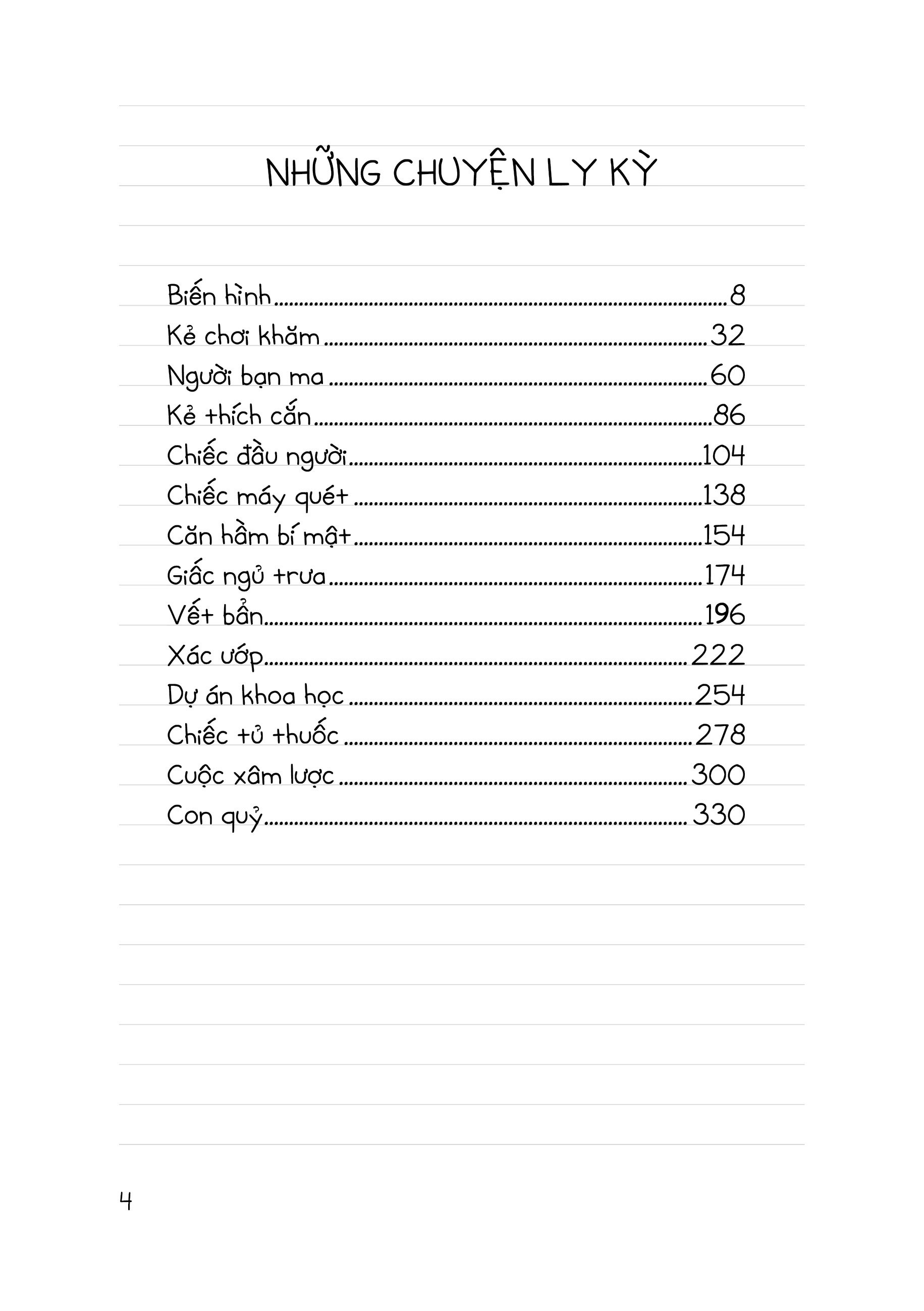 tính trung thực, tình bạn và tình cảm gia đình. 14 câu chuyện nhỏ xuất hiện trong sách gồm: Biến hình, Kẻ chơi khăm, Người bạn ma, Kẻ thích cắn, Chiếc đầu người, Chiếc máy quét, Căn hầm bí mật, Giấc ngủ trưa, Vết bẩn, Xác ướp, Dự án khoa học, Chiếc tủ thuốc, Cuộc xâm lược, và Con quỷ.