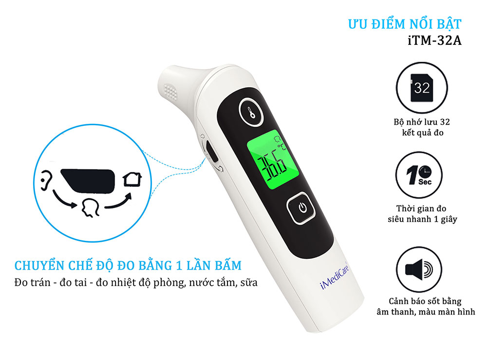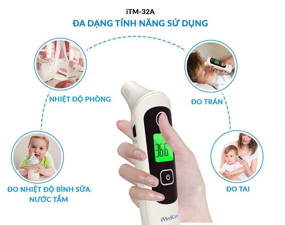 Với các bà mẹ đang có con nhỏ, việc sử sở hữu một chiếc nhiệt kế để theo dõi nhiệt độ cơ thể cho bé là điều cực kì cần thiết. Nhưng để lựa chọn mua được một chiếc nhiệt kế có nhiều tính năng, đo chính xác là điều không dễ dàng. Nhiệt kế điện tử hồng ngoại cao cấp iMediCare iTM-32A sử dụng công nghệ cảm biến của Đức cho kết quả chính xác với nhiều những chức năng như: đo nhiệt độ cơ thể qua đo trán – đo tai, đo nhiệt độ môi trường (nhiệt độ phòng ngủ), đo nhiệt độ nước tắm, nhiệt độ sữa.