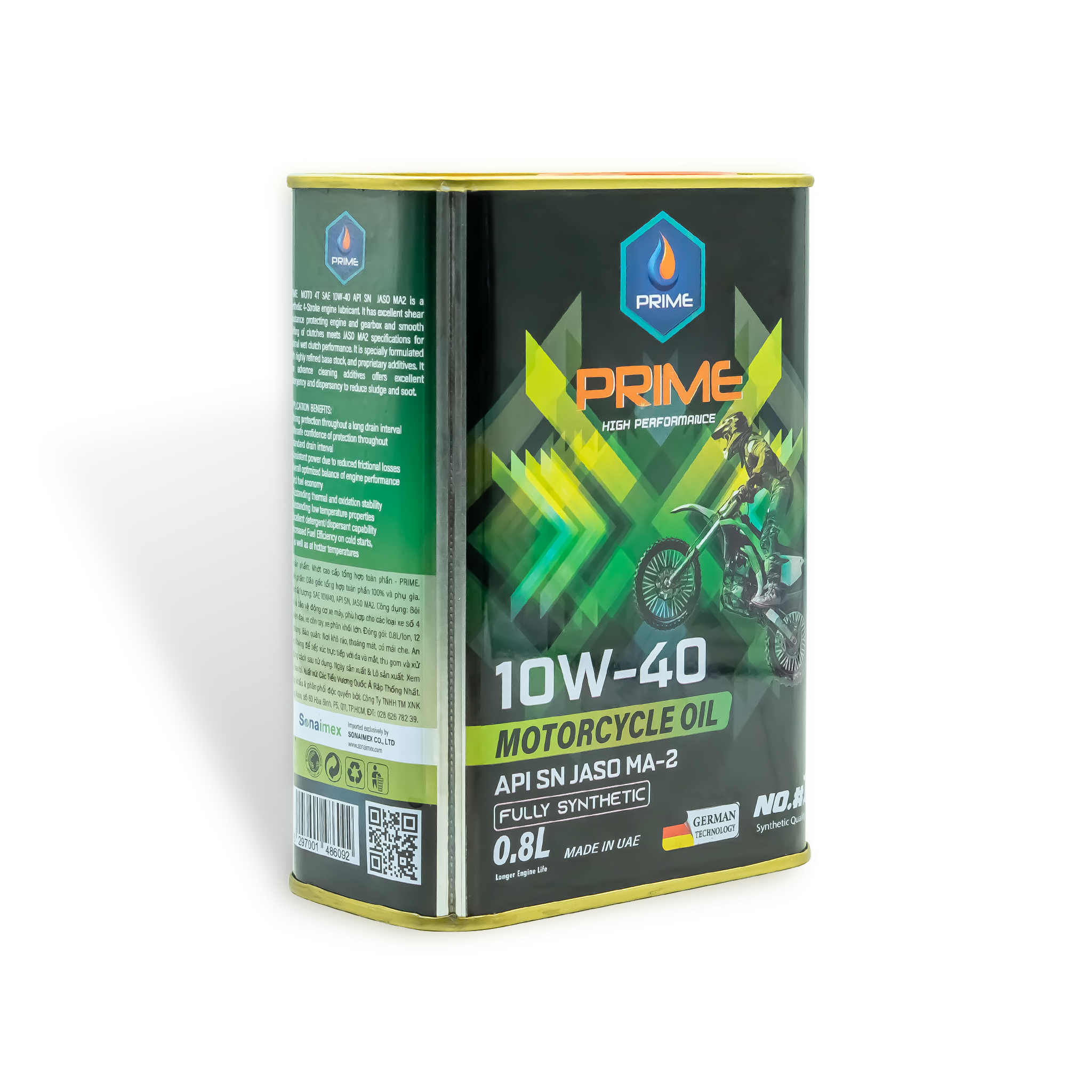 NHỚT TỔNG HỢP TOÀN PHẦN PRIME SAE 10W40, API SN, JASO MA2, FULLY SYNTHETIC LON 800ML NHẬP KHẨU 100%, CÔNG NGHỆ SẢN XUẤT ĐỨC (Chuyên dụng & đúng dung tích cho các dòng xe côn