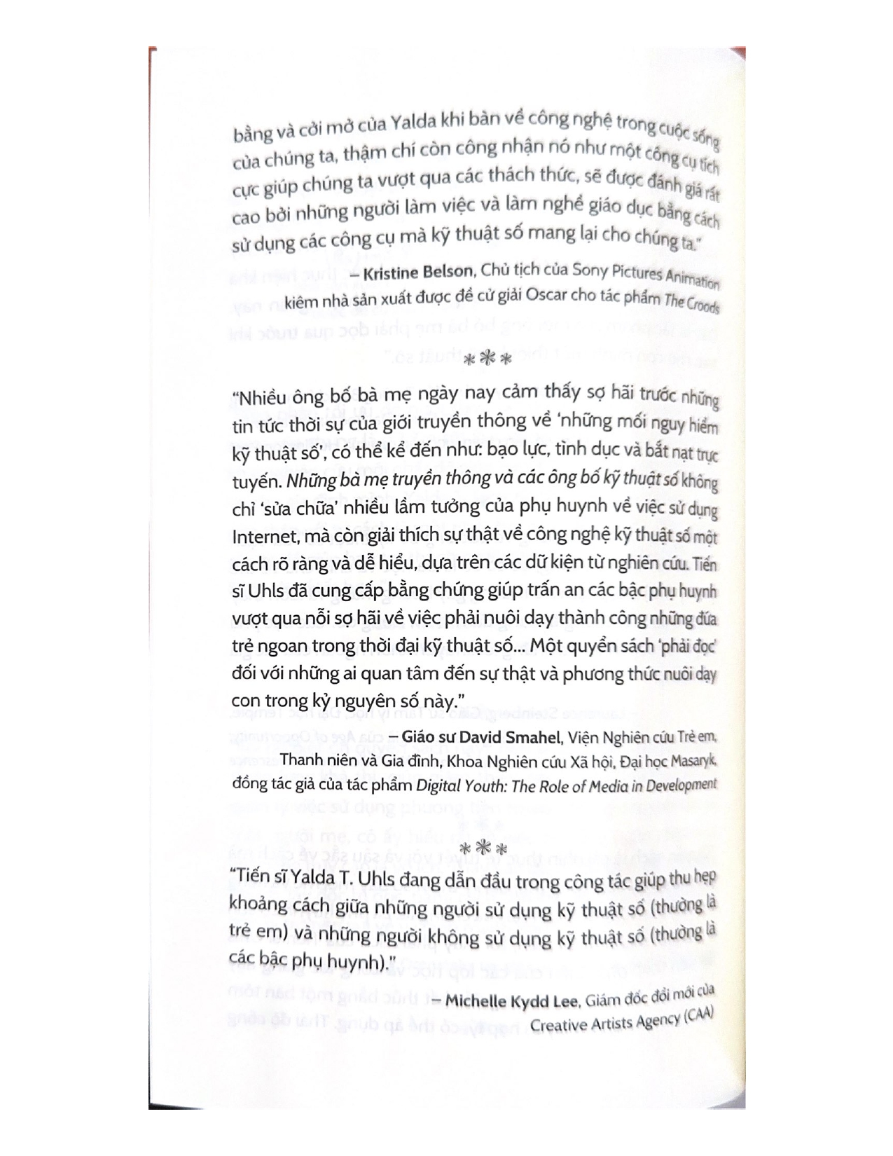 - Giới thiệu Những Bà Mẹ Truyền Thông Và Các Ông Bố Kỹ Thuật Số “Nhiều ông bố bà mẹ ngày nay cảm thấy sợ hãi trước những tin tức thời sự của giới truyền thông về “những mối nguy hiểm kỹ thuật số” như: bạo lực, tình dục và bắt nạt trực tuyến. Những bà mẹ truyền thông và các ông bố kỹ thuật số không chỉ “sửa chữa” nhiều lầm tưởng của phụ huynh về việc sử dụng Internet, mà còn giải thích sự thật về công nghệ kỹ thuật số một cách rõ ràng và dễ hiểu. Dựa trên các dữ kiện nghiên cứu, Tiến sĩ Uhls đã cung cấp bằng chứng giúp trấn an các bậc phụ huynh vượt qua nỗi sợ về việc phải nuôi dạy thành công những đứa trẻ ngoan trong thời đại kỹ thuật số. Đây là quyển sách “phải đọc” với những ai quan tâm đến sự thật và phương thức nuôi dạy con cái trong kỷ nguyên số này.”