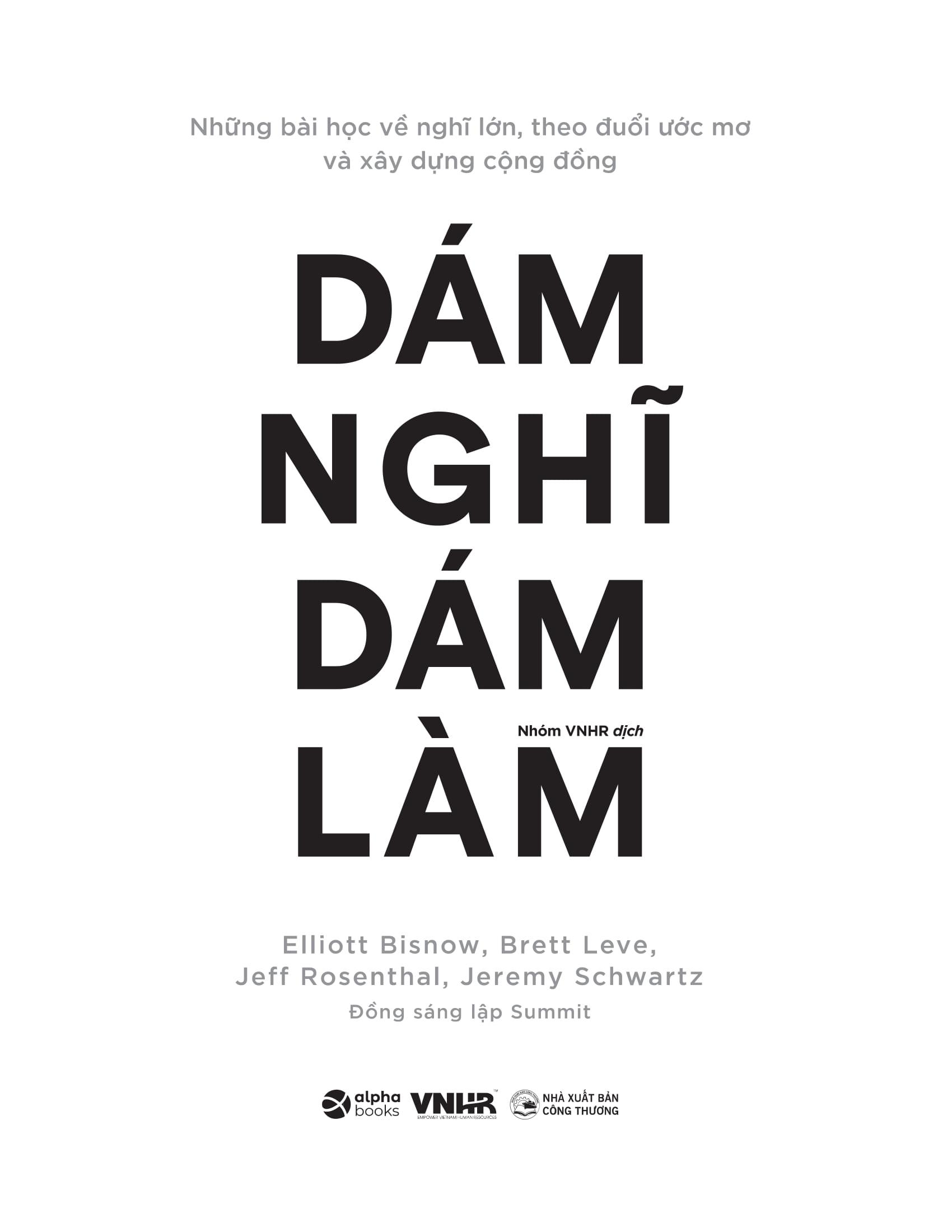 - Bất kỳ ai muốn đạt được mục tiêu lớn: Dù bạn đang làm việc trong lĩnh vực nào, cuốn sách này đều có thể cung cấp cho bạn những động lực và cảm hứng để đạt được những thành công vượt trội. II. TÓM TẮT SÁCH Năm 2008, bốn chàng trai trẻ tuổi, chưa có nhiều kinh nghiệm Elliott Bisnow, Brett Leve, Jeff Rosenthal và Jeremy Schwartz làm quen với nhau và bắt đầu tổ chức một sự kiện quy tụ những nhà khởi nghiệp trẻ triển vọng nhất nước Mỹ lúc bấy giờ. Trải qua nhiều thách thức và nhiều lời từ chối cũng như khó khăn về tài chính - như bất cứ công ty mới khởi nghiệp nào, họ đã phát triển Summit thành một cộng đồng toàn cầu với các sự kiện trên khắp thế giới, với sự tham gia của nhiều nhân vật nổi tiếng bao gồm Jeff Bezos, Richard Branson, Sam Altman (CEO OpenAI), Tony Hsieh (CEO quá cố của Zappos), Evan Williams (đồng sáng lập Twitter), Garrett Camp (đồng sáng lập Uber), Jessica Alba (diễn viên)... Năm 2013, các nhà sáng lập Summit đã mua lại Powder Mountain, khu nghỉ dưỡng trượt tuyết lớn nhất nước Mỹ với ước mơ xây dựng một thị trấn trên đỉnh núi của tương lai. Trong Dám nghĩ dám làm, các tác giả tiết lộ những chiến thắng, sai lầm và bài học từ hành trình của mình, bắt đầu trong thời kỳ Đại suy thoái và tiếp tục cho đến ngày nay. Cùng với những bài học từ một số doanh nhân truyền cảm hứng nhất lúc bấy giờ, các tác giả cung cấp những ý chính quan trọng: • Bất cứ ý tưởng nào đều nên được nói ra. • Mua danh ba vạn, bán danh ba đồng. • Không có đường tắt dẫn đến thành công. • Xây dựng mối quan hệ là điều quan trọng nhất. Dám nghĩ dám làm cho thấy bất kỳ ai cũng có thể nghĩ lớn và - với khát khao kiến thức, một đội ngũ tài năng và một chút khiêm tốn - đạt được điều không thể. III. CUỐN SÁCH CÓ GÌ ĐẶC BIỆT