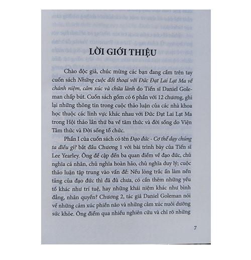 Bằng những cuộc trò chuyện sâu sắc giữa Đức Đạt Lai Lạt Ma với các nhà khoa học, tác phẩm mở ra một góc nhìn toàn diện và thấu đáo về mối liên hệ giữa cảm xúc - hành vi - chánh niệm. Qua đó, người đọc không chỉ hiểu được nguyên nhân gốc rễ của những tổn thương tinh thần mà còn được hướng dẫn những phương pháp thiền chánh niệm thực hành hằng ngày, để từ đó tự mình vững vàng bước vào hành trình chữa lành từ bên trong.