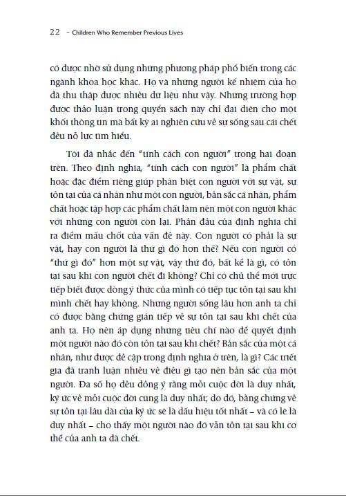 Công trình nghiên cứu của Tiến sĩ Stevenson còn đưa ra một cái nhìn tổng quan về lịch sử của niềm tin vào luân hồi, các bằng chứng củng cố niềm tin này thông qua các vết bớt, dị tật bẩm sinh… Cả những thành tựu mới trong lĩnh vực di truyền học cũng được tác giả khéo léo lồng ghép vào quyển sách.