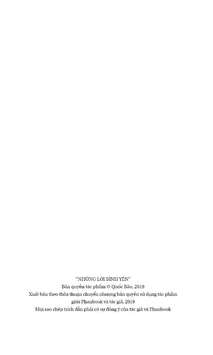 Đây là những LỜI HÁT, không phải thơ. Giở một thi tập, bạn đọc bằng mắt, đọc thầm. Giở một tập lời hát, bạn ngân nga âm ư những giai điệu. Soạn lời hát, với tôi, là công việc sau cùng, thực hiện khi mọi thành tố của một nhạc phẩm đã được đặt đúng vị trí, chỉ còn chờ người đến ca. Để người đến ca hài lòng (và đôi lúc, hạnh phúc), tôi đã đặt lời. Những lời viết ra ở dòng phụ tờ giấy nhạc, trên mảnh giấy bạc bao thuốc lá, mặt sau một trang ghi chú, thường được viết rất nhanh - có khi chỉ đúng bằng thời lượng bản ghi âm nháp mà tôi yêu cầu bật lên ở studio. Hôm nay tôi tập hợp chúng ở đây, trong một tập sách khiêm cung nhỏ nhẻ. Một trăm lời hát, một phần mười số ca khúc tôi đã viết. Để một hoàng hôn nhẹ nhõm nào đó, bạn ngân nga âm ư chúng. Không nhất thiết giai điệu của bạn phải giống hệt giai điệu đã được ghi âm: đó mới đích thực là mong muốn của tôi. Nhạc sĩ QUỐC BẢO