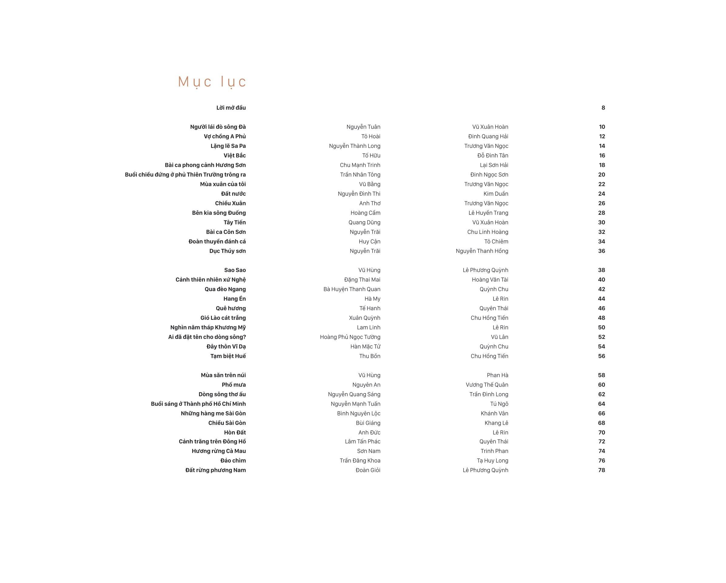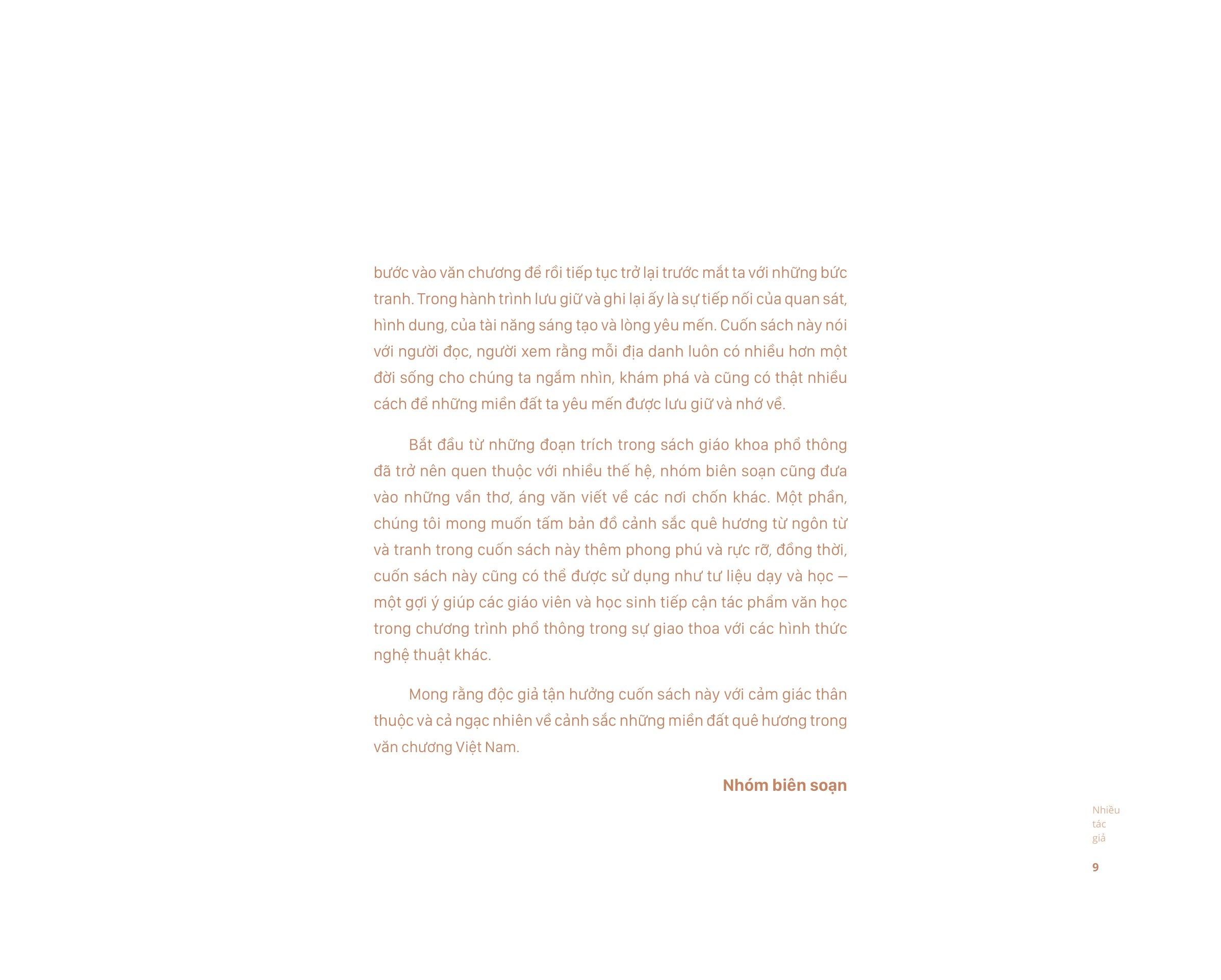 Mong rằng độc giả tận hưởng cuốn sách này với cảm giác thân thuộc và cả ngạc nhiên về cảnh sắc những miền đất quê hương trong văn chương Việt Nam.”