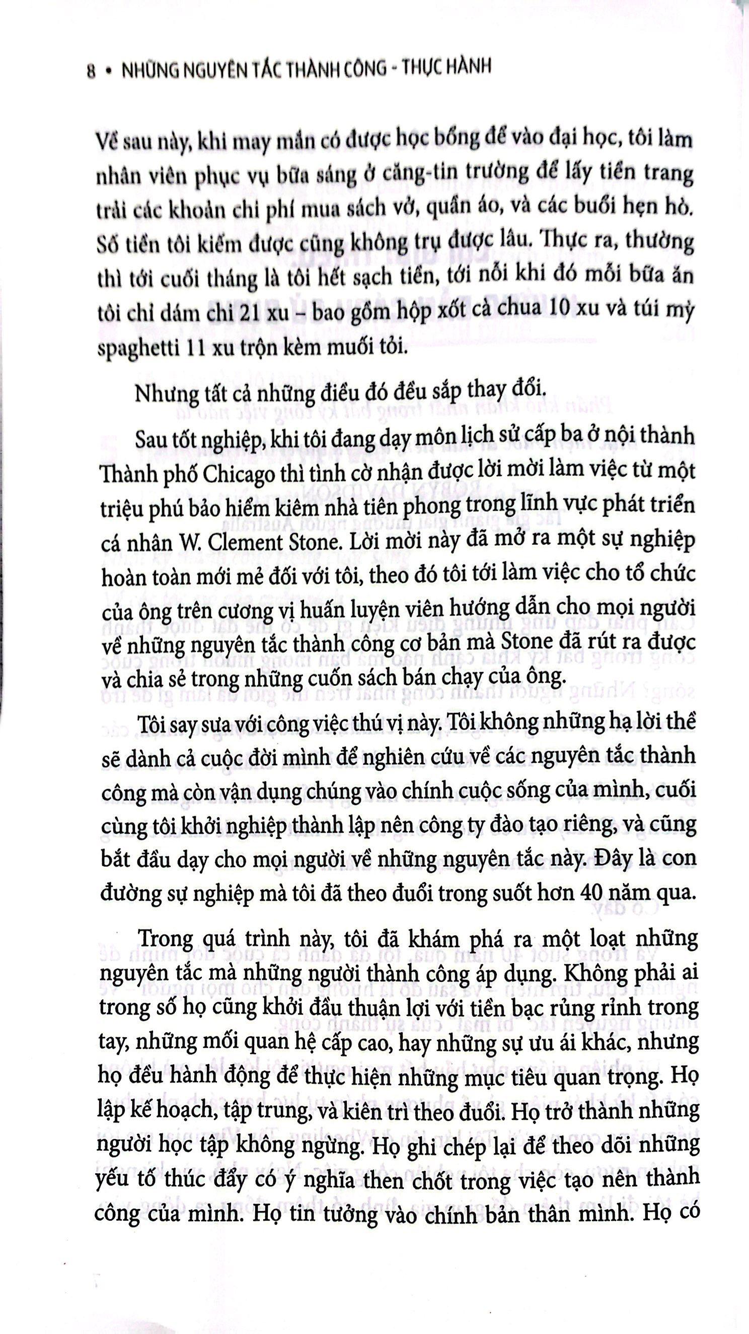 Những Nguyên Tắc Thành Công - Thực Hành Cần phải đáp ứng những điều kiện gì để có thể đạt được thành công trong bất kỳ khía cạnh nào mà bạn mong muốn trong cuộc sống? Những người thành công nhất trên thế giới đã làm gì để trở nên xuất sắc trong sự nghiệp, tài chính, các hoạt động từ thiện, các mối quan hệ, và nhiều khía cạnh khác? Phải chăng ở họ có điều gì đó đặc biệt – chẳng hạn như những phẩm chất mà người khác không có? Hay liệu có một “công thức bí mật” nào để tất cả chúng ta đều có thể làm theo và đạt được thành công? Có đấy. Và trong suốt 40 năm qua, nhóm tác giả đã dành cả cuộc đời m.ình để nghiên cứu, tìm hiểu – và sau đó là hướng dẫn cho mọi người – về những nguyên tắc “bí mật” của sự thành công. Là cuốn sách hướng dẫn đi kèm với cuốn Những nguyên tắc thành công, cuốn sổ tay thực hành này được thiết kế để giúp bạn đi từ vị trí hiện tại mà bạn đang đứng đến vị trí mà bạn muốn đạt được. Bất luận bạn đã đọc cuốn sách Những nguyên tắc thành công nguyên bản hay chưa, cuốn sách này vẫn phù hợp với bạn, bởi nó được viết dành cho cả hai nhóm đối tượng độc giả. Nếu bạn đã nắm được các nguyên tắc thành công, cuốn sách này sẽ giúp bạn đưa chúng vào thực hành trong cuộc sống hằng ngày. Còn nếu bạn mới làm quen với dòng sách phát triển cá nhân, mỗi chương trong cuốn sách sẽ cung cấp cho bạn những thông tin thiết yếu mà bạn cần học, hiểu, và thực hành các nguyên tắc mà bạn khám phá được. Mục lục Lời giới thiệu: Hướng dẫn cách sử dụng