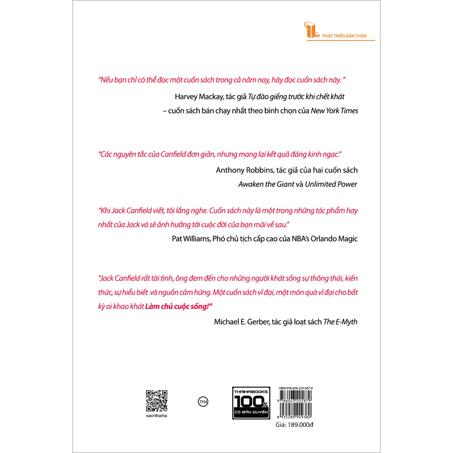 - Chủ động sử dụng mọi phương tiện giao tiếp để truyền cảm hứng, kích thích người khác. Hãy chú ý tới cảm giác của bạn khi thực hiện điều đó. Phần 5: Thành công và tiền bạcở phần này Tác giả sẽ chỉ ra cách thức phát triển nhận thức tích cực về tiền bạc, làm thế nào bạn đảm bảo đủ tiền để sống theo phong cách bạn mong muốn. Bạn đạt được những điều bạn tập trung vào: Chúng ta cần phải tập trung vào những vấn đề chúng ta mong muốn đạt được, nếu mong muốn giàu có chúng ta cần phải suy nghĩ đến nó và lên kế hoạch, đừng nghĩ đến có thể hay không, chỉ khi thực hiện và xem nó là trung tâm bạn mới có thể tìm ra con đường chinh phục nó. “Nếu bạn không muốn coi trọng và kiếm tìm sự giàu có, bạn sẽ gần như không trở nên giàu có được. Bạn cần tìm kiếm sự thịnh vượng thì nó mới tìm kiếm bạn. Nếu bạn không có ước mơ làm giàu cháy bỏng, bạn sẽ không bao giờ giàu có được. Để làm giàu bạn cần xác định mục tiêu giàu có thật rõ ràng.” Làm chủ trò chơi tiêu dùng: “Có quá nhiều người tiêu xài các khoản tiền họ không làm ra để mua những vật dụng họ không muốn để gây ấn tượng với những người họ không ưa”. Mình nghĩ điều này là không cần thiết vì chỉ khi bạn đã đi làm kiếm ra tiền bạn mới có thể hiểu được giá trị khi kiếm những đồng tiền đó, nó không hề dễ dàng. Và tiền cũng không phải là vô hạn, chúng ta cần chi tiêu hợp lý vào các vấn đề cần thiết trong cuộc sống. Nếu muốn chi tiêu nhiều tiền thì bạn cần phải làm ra nhiều tiền. Phần 6: Thành công bắt đầu ngay từ thời điểm này phần này nói về tầm quan trọng của việc bắt tay thực hiện ngay bây giờ và khuyến khích mọi người cùng tham gia. Hãy bắt tay hành động ngay từ bây giờ: Ngay bây giờ hoặc không bao giờ, không bao giờ là quá muộn để bạn bắt đầu một cuộc hành trình. Hãy sắp xếp thời gian thật hợp lý, đề ra mục tiêu, kế hoạch để chinh phục cuộc sống mà bạn mơ ước. Tự tạo cho mình suy nghĩ tích cực làm động lực để hoàn thành công việc một cách tốt nhất. Thế giới này chính là những gì bạn nghĩ về nó. Thành công không còn là một bí mật nhưng bạn phải là người làm chủ chính mình, cố gắng tiến về phía trước. Tác giả: Jack Canfield là một diễn thuyết gia nổi tiếng, tốt nghiệp đại học Harvard, nhận bằng cao học của Đại học Massachusetts và học vị tiến sĩ của đại học Santa Monica. Năm 1973, ông được tổ chức Jaycees vinh danh là một trong mười người đàn ông xuất chúng của nước Mỹ.