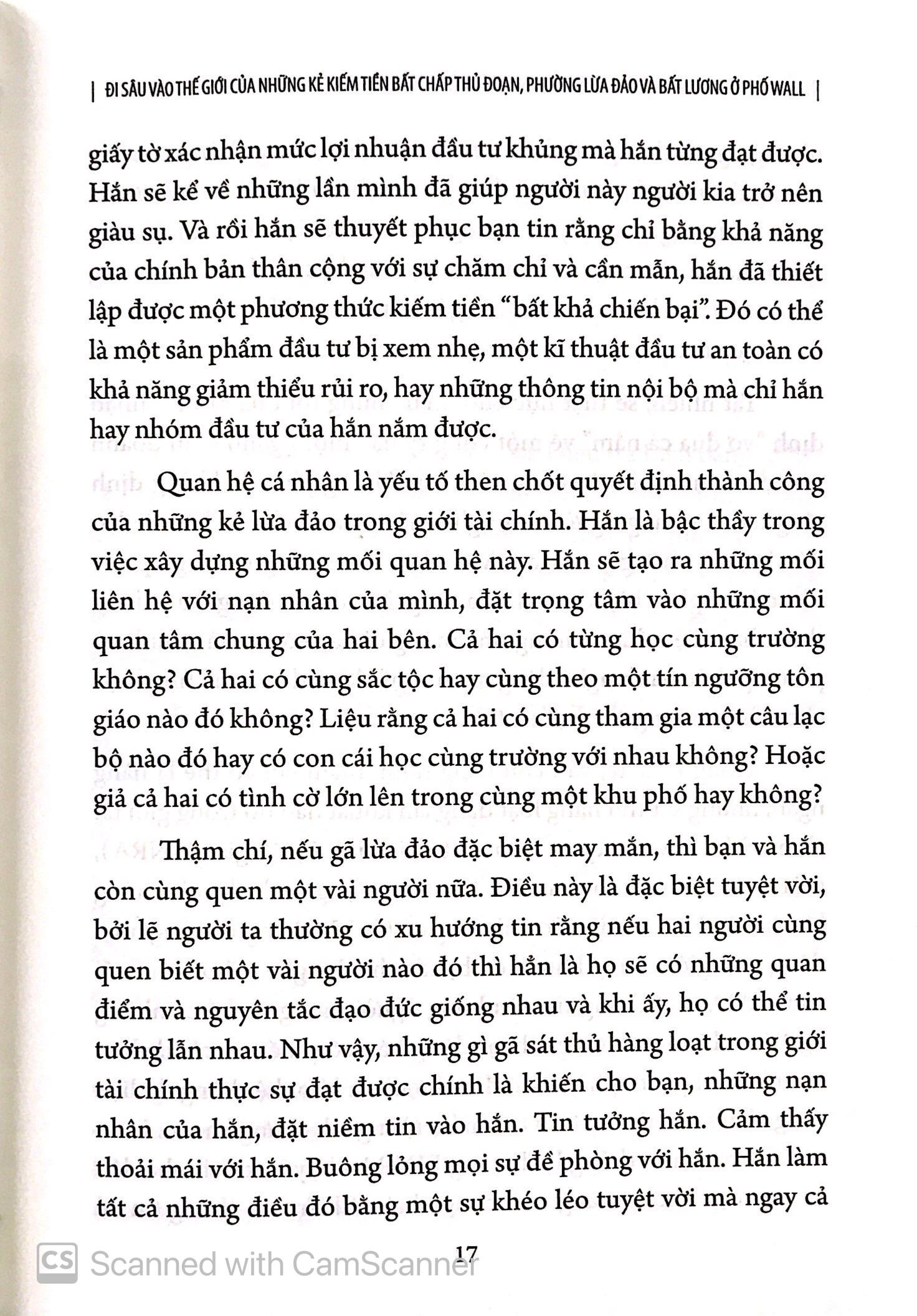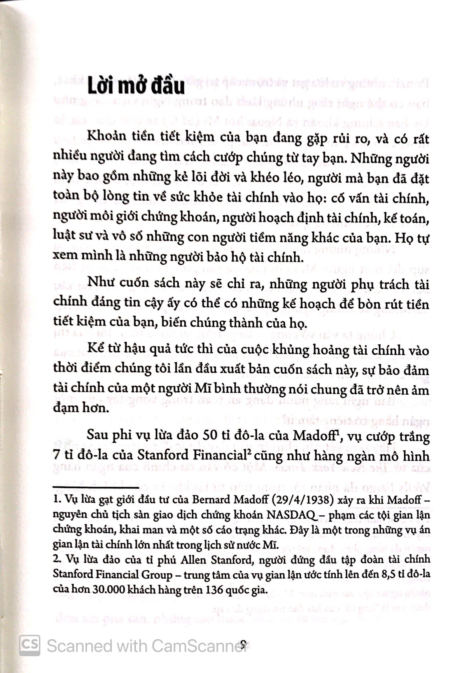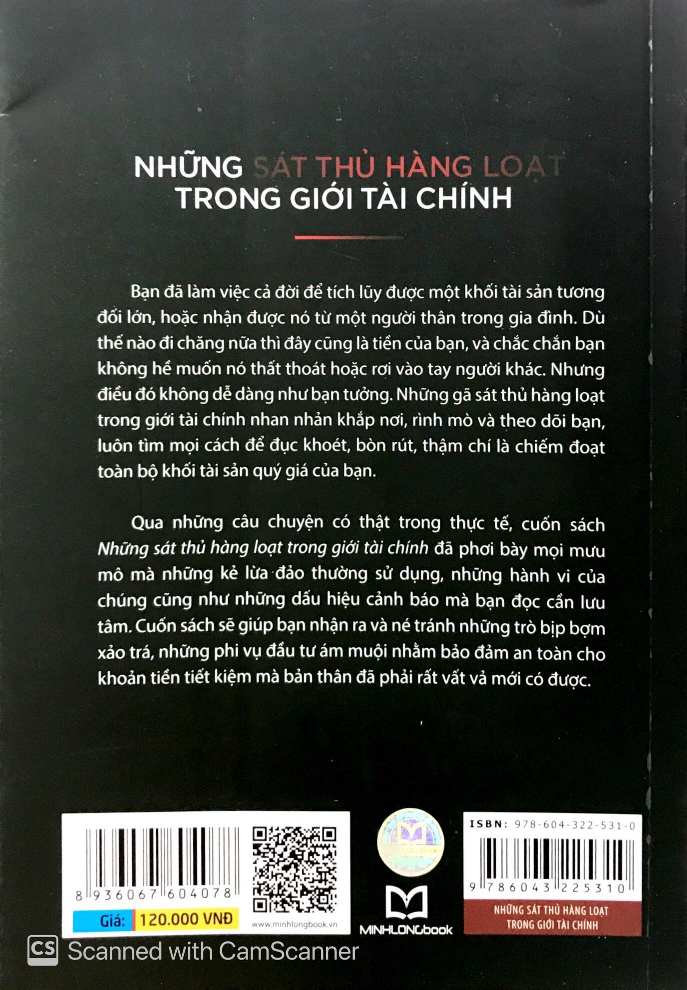 Bạn đã làm việc cả đời để tích lũy được một khối tài sản tương đối lớn, hoặc nhận được nó từ một người thân trong gia đình. Dù thế nào đi chăng nữa thì đây cũng là tiền của bạn, và chắc chắn bạn không hề muốn nó thất thoát hoặc rơi vào tay người khác. Nhưng điều đó không dễ dàng như bạn tưởng. Những gã sát thủ hàng loạt trong giới tài chính nhan nhản khắp nơi, rình mò và theo dõi bạn, luôn tìm mọi cách để đục khoét, bòn rút, thậm chí là chiếm đoạt toàn bộ khối tài sản quý giá của bạn. Qua những câu chuyện có thật trong thực tế, cuốn sách Những sát thủ hàng loạt trong giới tài chính đã phơi bày mọi mưu mô mà những kẻ lừa đảo thường sử dụng, những hành vi của chúng cũng như những dấu hiệu cảnh báo mà bạn đọc cần lưu tâm. Cuốn sách sẽ giúp bạn nhận ra và né tránh những trò bịp bợm, xảo trá, những phi vụ đầu tư ám muội nhằm bảo đảm an toàn cho khoản tiền tiết kiệm mà bản thân đã phải rất vất vả mới có được.