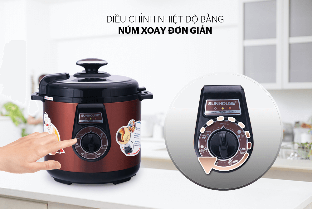 - Có thiết bị bảo vệ giới hạn nhiệt độ, nồi sẽ tự động ngắt điện khi nồi đang được đun trong trạng thái rỗng không hoặc không có miếng đệm vung nồi bên trong Đa chức năng nấu Bạn có thể dùng nồi để nấu cơm, nấu canh, nấu cháo, nấu súp hoặc đun nước theo chế độ hẹn giờ để tiết kiệm thời gian chuẩn bị, không phải đứng bếp quá lâu. Có chức năng hẹn 24 giờ Nồi Áp Suất Điện Đa Năng Sunhouse trang bị chức năng hẹn giờ lên đến 24 tiếng, tạo điều kiện thuận lợi để bạn rảnh tay làm những công việc khác trong lúc chờ đợi thực phẩm chín. Điều khiển bằng chip điện tử Nồi Áp Suất Điện Tử Đa Năng Sunhouse điều khiển bằng chip điện tự thông minh, hệ thống sẽ vận hành theo những chương trình đã được cài đặt sẵn giúp tiết kiệm thời gian cho bạn. Bên cạnh đó, sản phẩm còn trang bị bảng điều khiển bằng tiếng Việt tạo sự thuận lợi khi sử dụng. Dung tích lớn Nồi Áp Suất Điện Đa Năng Sunhouse có dung tích 6 lít rộng rãi cho bạn thoải mái chế biến các món cơm, canh, soup, hầm,… chiêu đãi gia đình và bạn bè. Nút điều chỉnh bằng tiếng Việt dễ dùng Nồi Áp Suất Điện Đa Năng Sunhouse sử dụng bảng điều khiển dạng nút vặn có hướng dẫn sử dụng bằng tiếng Việt, giúp bạn dễ dàng thao tác và sử dụng nhanh chóng ngay từ lần đầu tiên. Không làm mất dinh dưỡng của thực phẩm Nồi Áp Suất Điện Đa Năng Sunhouse giúp nấu kín hoàn toàn nên bạn có thể đặt thời gian nấu dưới áp suất theo các loại thức ăn khác nhau để tránh việc mất chất dinh dưỡng của các thực phẩm có hàm lượng dinh dưỡng cao đồng thời giúp thực phẩm được mềm và ngon hơn. Công suất lớn, nấu ăn nhanh Nồi Áp Suất Điện Đa Năng Sunhouse được cài đặt chế độ nấu nhanh, dựa trên công nghệ áp suất điện, bạn có thể hầm xương giò chỉ trong vòng 15 phút mà vẫn giữ được hương vị của thực phẩm. Công suất lên đến 900W giúp nấu thức ăn chín nhanh, rút ngắn giai đoạn chuẩn bị những món hầm, ninh. Tiết kiệm thời gian và điện năng Nồi Áp Suất Điện Đa Năng Sunhouse có khả năng giữ nhiệt độ ổn định với hiệu quả giữ ấm hơn 80% và tiết kiệm tới 30% điện năng so với nồi điện thông thường nên bạn có thể yên tâm sử dụng. Hướng dẫn sử dụng