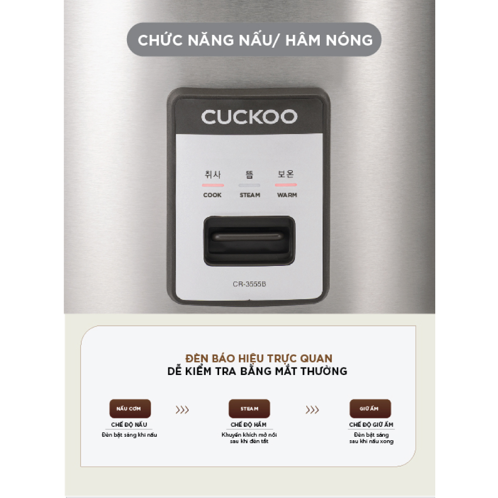 Nồi Cơm Điện Công Nghiệp Cuckoo CR-3555 - 1460W - 6.3L Nồi cơm Cuckoo CR-3555 là chiếc nồi cơm điện công nghiệp mang thương hiệu nổi tiếng Cuckoo của Hàn Quốc. Nồi hoạt động với