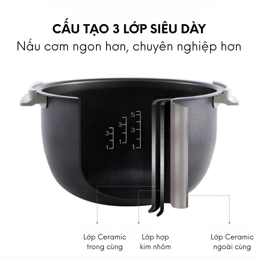 Lòng nồi tráng nhiều lớp hợp kim ép dọc rất dày dặn và bền Mâm nấu từ với công suất là 1455W Màn hình điện tử thông minh có nhiều chế độ: nấu cơm, cháo,