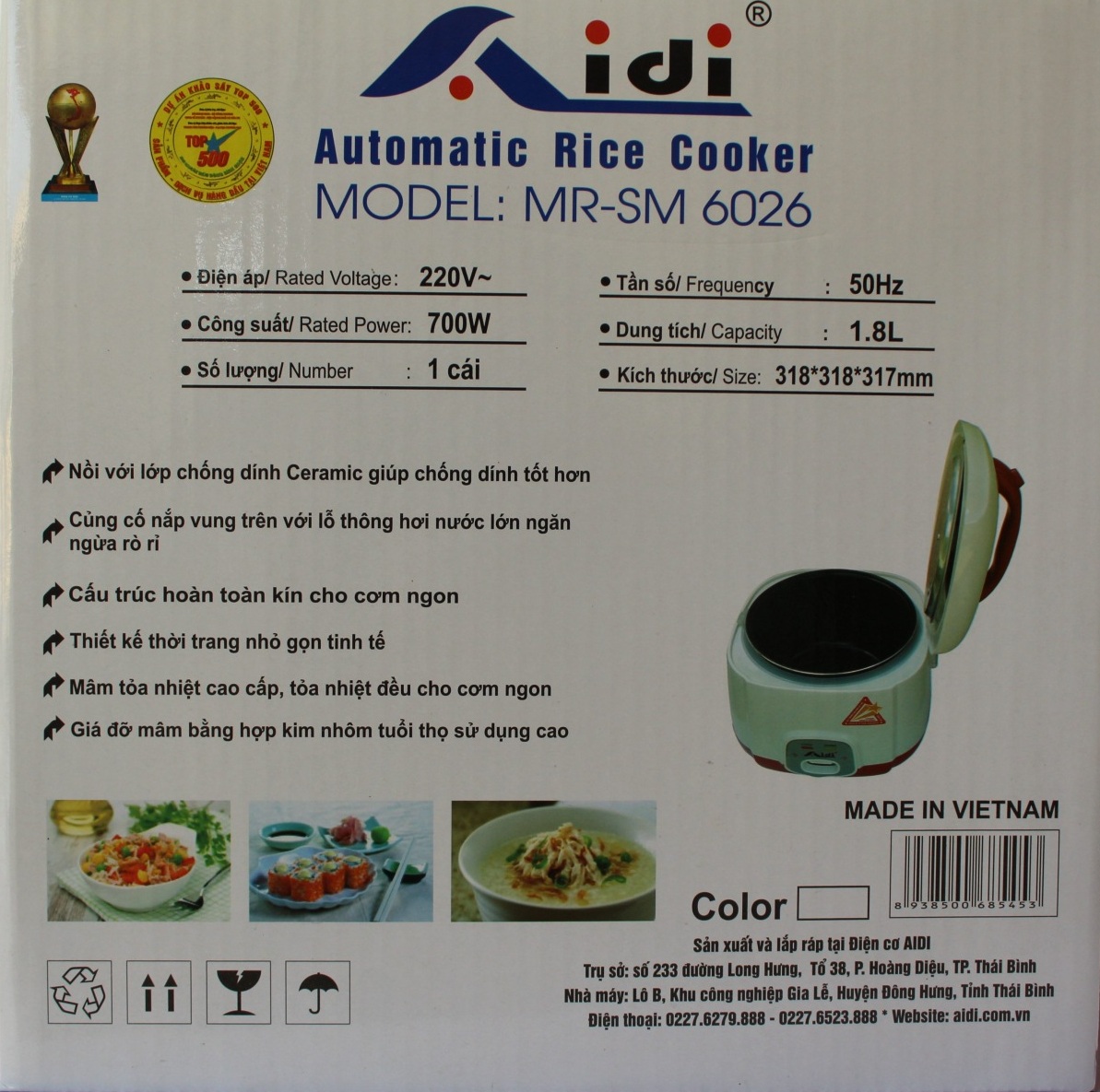 Nồi Cơm Điện Nắp Gài Thân Nhựa Ủ Đa Chiều Aidi MR-SM 6026 (1,8 lít) - Màu Ngẫu Nhiên- Chính Hãng ĐẶC ĐIỂM NỔI BẬT Đường kính mâm nhiệt lớn,tỏa nhiệt đều, cơm ngon hơn