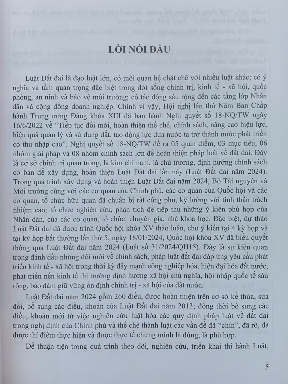 Luật Đất đai là đạo luật lớn, có mối quan hệ chặt chẽ với nhiều luật khác; có ý nghĩa và tầm quan trọng đặc biệt trong đời sống chính trị, kinh tế - xã hội, quốc phòng, an ninh và bảo vệ môi trường; có tác động sâu rộng đến các tầng lớp Nhân dân và cộng đồng doanh nghiệp. Chính vì vậy, Hội nghị lần thứ Năm Ban Chấp hành Trung ương Đảng khóa XIII đã ban hành Nghị quyết số 18-NQ/TW ngày 16/6/2022 về “Tiếp tục đổi mới, hoàn thiện thể chế, chính sách, nâng cao hiệu lực, hiệu quả quản lý và sử dụng đất, tạo động lực đưa nước ta trở thành nước phát triển có thu nhập cao”. Nghị quyết số 18-NQ/TW đề ra 05 quan điểm, 03 mục tiêu, 06 nhóm giải pháp và 08 nhóm chính sách lớn để hoàn thiện pháp luật về đất đai. Đây là cơ sở chính trị quan trọng, là kim chỉ nam, là chủ trương, định hướng chính sách cơ bản để xây dựng, hoàn thiện Luật Đất đai lần này (Luật Đất đai năm 2024). Trong quá trình xây dựng và hoàn thiện Luật Đất đai năm 2024, Bộ Tài nguyên và Môi trường cùng với các cơ quan của Chính phủ, các cơ quan của Quốc hội và các cơ quan, tổ chức hữu quan đã chuẩn bị rất công phu, kỹ lưỡng với tinh thần trách nhiệm cao; tổ chức nghiên cứu, phân tích để tiếp thu những ý kiến phù hợp của Nhân dân, của các cơ quan, tổ chức, chuyên gia, nhà khoa học. Đặc biệt, dự thảo Luật Đất đai đã được trình Quốc hội khóa XV thảo luận, cho ý kiến tại 4 kỳ họp và tại kỳ họp bất thường lần thứ 5, ngày 18/01/2024, Quốc hội khóa XV đã biểu quyết thông qua Luật Đất đai năm 2024 (Luật số 31/2024/QH15). Đây là sự kiện quan trọng đánh dấu những đổi mới về chính sách, pháp luật đất đai đáp ứng yêu cầu phát triển kinh tế - xã hội trong thời kỳ đẩy mạnh công nghiệp hóa, hiện đại hóa đất nước, phát triển nền kinh tế thị trường định hướng xã hội chủ nghĩa, hội nhập quốc tế sâu rộng, bảo đảm giữ vững ổn định chính trị - xã hội của đất nước.