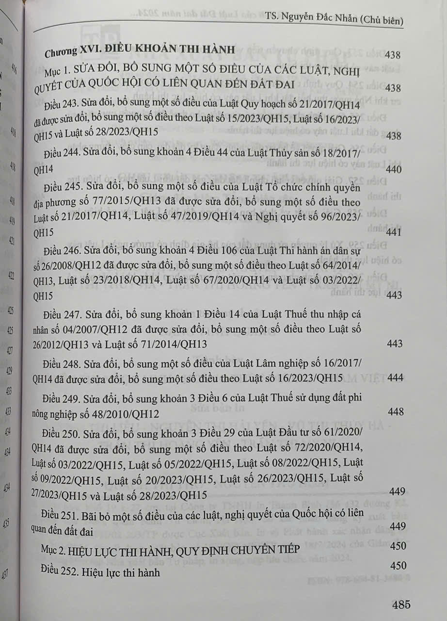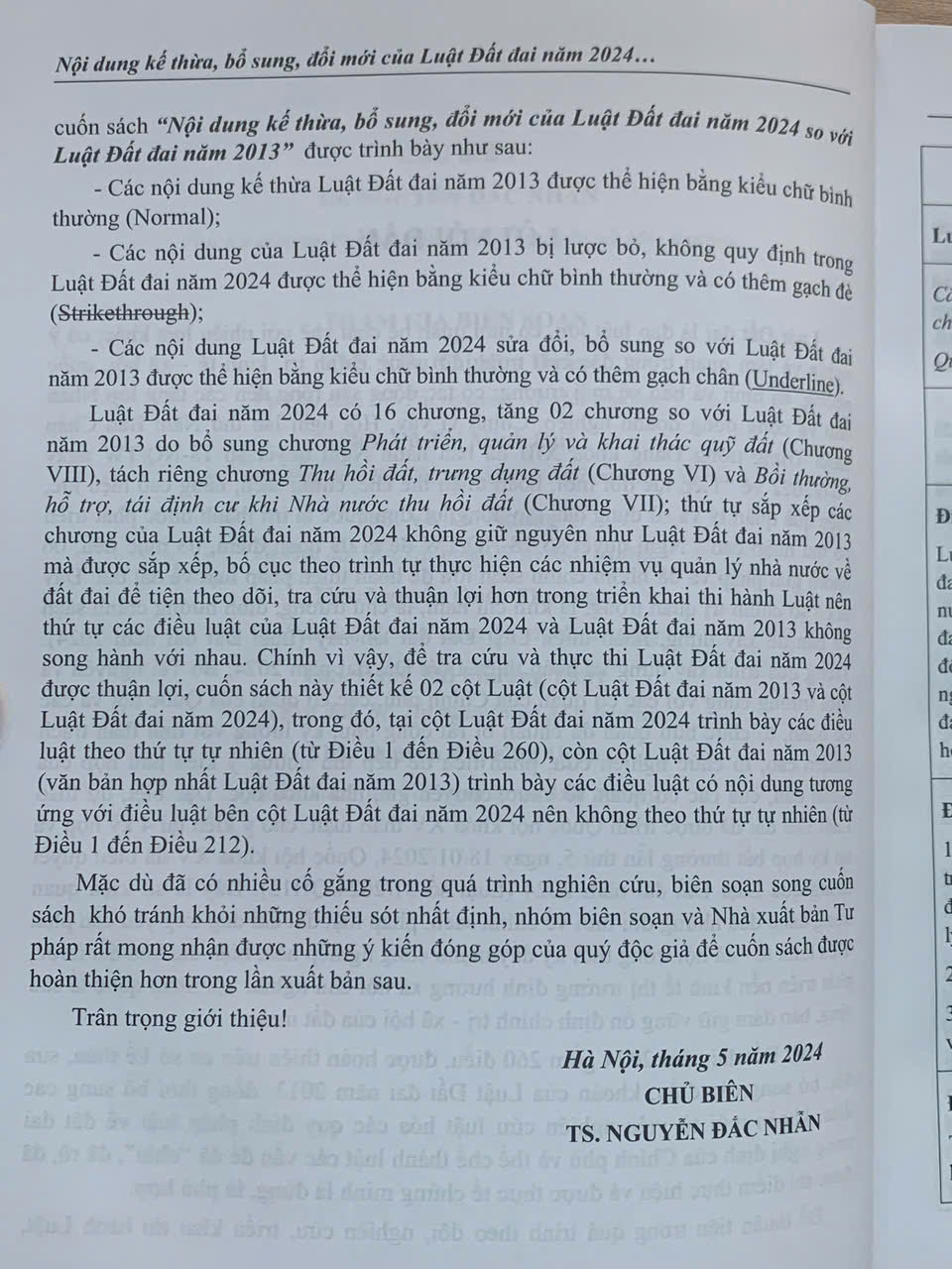 Luật Đất đai năm 2024 có 16 chương, tăng 02 chương so với Luật Đất đai năm 2013 do bổ sung chương Phát triển, quản lý và khai thác quỹ đất (Chương VIII), tách riêng chương Thu hồi đất, trưng dụng đất (Chương VI) và Bồi thường, hỗ trợ, tái định cư khi Nhà nước thu hồi đất (Chương VII); thứ tự sắp xếp các chương của Luật Đất đai năm 2024 không giữ nguyên như Luật Đất đai năm 2013 mà được sắp xếp, bố cục theo trình tự thực hiện các nhiệm vụ quản lý nhà nước về đất đai để tiện theo dõi, tra cứu và thuận lợi hơn trong triển khai thi hành Luật nên thứ tự các điều luật của Luật Đất đai năm 2024 và Luật Đất đai năm 2013 không song hành với nhau. Chính vì vậy, để tra cứu và thực thi Luật Đất đai năm 2024 được thuận lợi, cuốn sách này thiết kế 02 cột Luật (cột Luật Đất đai năm 2013 và cột Luật Đất đai năm 2024), trong đó, tại cột Luật Đất đai năm 2024 trình bày các điều luật theo thứ tự tự nhiên (từ Điều 1 đến Điều 260), còn cột Luật Đất đai năm 2013 (văn bản hợp nhất Luật Đất đai năm 2013) trình bày các điều luật có nội dung tương ứng với điều luật bên cột Luật Đất đai năm 2024 nên không theo thứ tự tự nhiên (từ Điều 1 đến Điều 212).