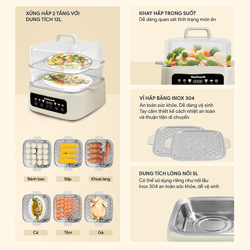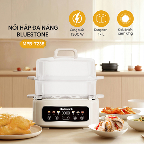 Nồi hấp đa năng Bluestone MPB-7235 - Công suất: 1500W - Dung tích xửng hấp: 12L - Dung tích lòng nồi: 3L - Xửng hấp 2 tầng có thể hấp nhiều món cùng lúc -