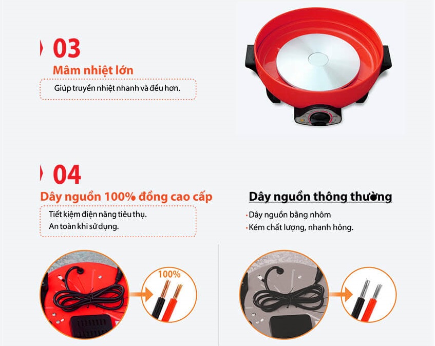 Đặc điểm nổi bật - Nồi lẩu điện đa năng: Lẩu, nướng, chiên, xào, rán, hấp - Dung tích lớn 5.0 lít, phù hợp cho nhu cầu 4 - 6 người. - Nồi nhôm đúc nguyên chất có độ