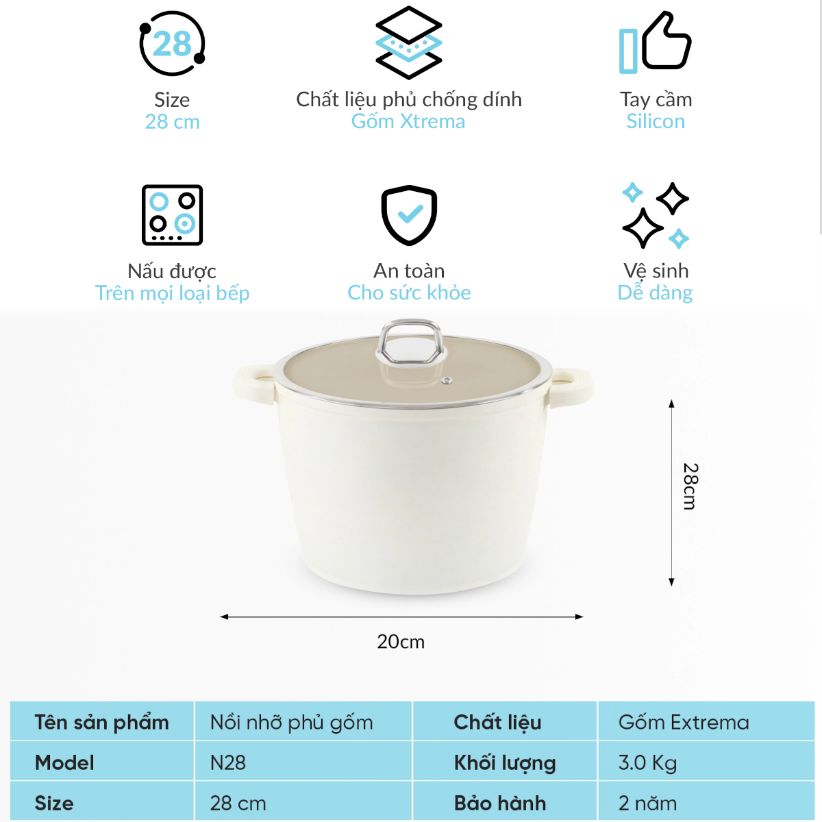 Nồi luộc gà chống dính phủ gốm Hàn Quốc dung tích 10L size 28cm Tên sản phẩm: Nồi luộc gà nhôm chống dính phủ gốm  Model: N28 Kích thước: Ø28 x cao 20cm (đường kính miệng 28cm, cao 20cm,