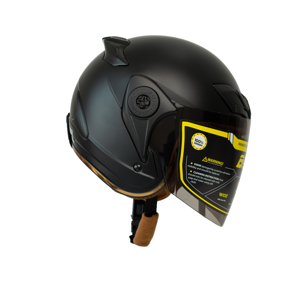 THIẾT KẾ THÔNG MINH - Phong cách thiết kế: mũ kiểu 3/4 kèm kính dài, mũ được thiết kế dáng tròn, đi kèm 2 miếng ốp má, giúp tăng thêm hiệu quả bao phủ, bảo