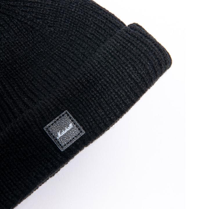 Classic minimalist unisex fisherman beanie in black with vegan leather Marshall logo badge. Tackle Cthulhu, Moby Dick, or The Kraken with ease… or just look slick in your day to day life. This super-soft, ribbed