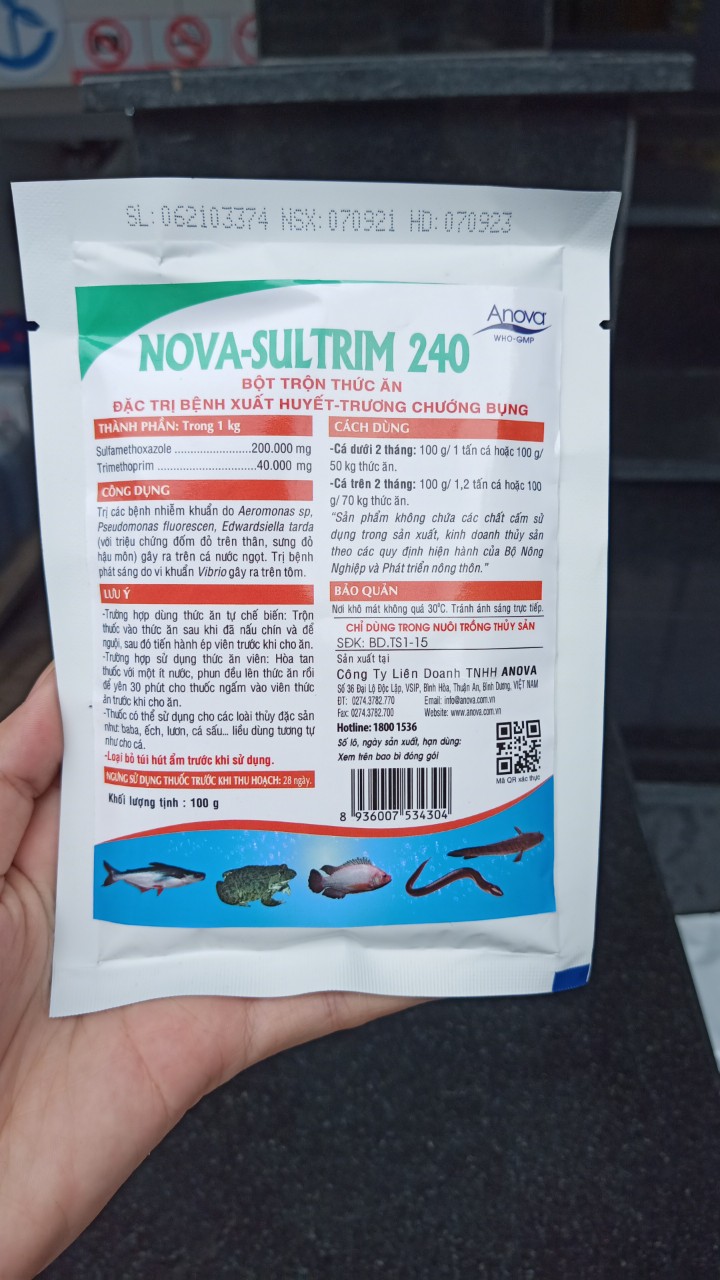 Mua tại TiktokNova-Sultrim 240 Đặc Trị Bệnh Xuất Huyết – Trương Chướng Bụng Ở Cá Mã hàng: Nova-Sultrim 240 Hãng sản xuất: Anova – Việt Nam Thành phần trong 1kg: Sulfamethoxazole………… gr Trimethoprim………………….40 gr Công dụng: