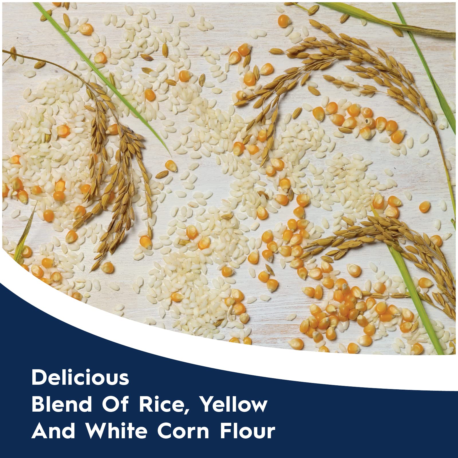 Thành phần : Bột ngô trắng (60%), bột ngô vàng (29,5%), bột gạo nâu nguyên cám (10%), nước, chất nhu hoá: Mono và diglycerid của các acid béo- Giá trị dinh dưỡng: Năng lượng 363 kcal; Chất đạm 6,9g; Chất béo 1,5g; Carbohydrate 79,6g; Muối 0,002g; Chất xơ 1,7g