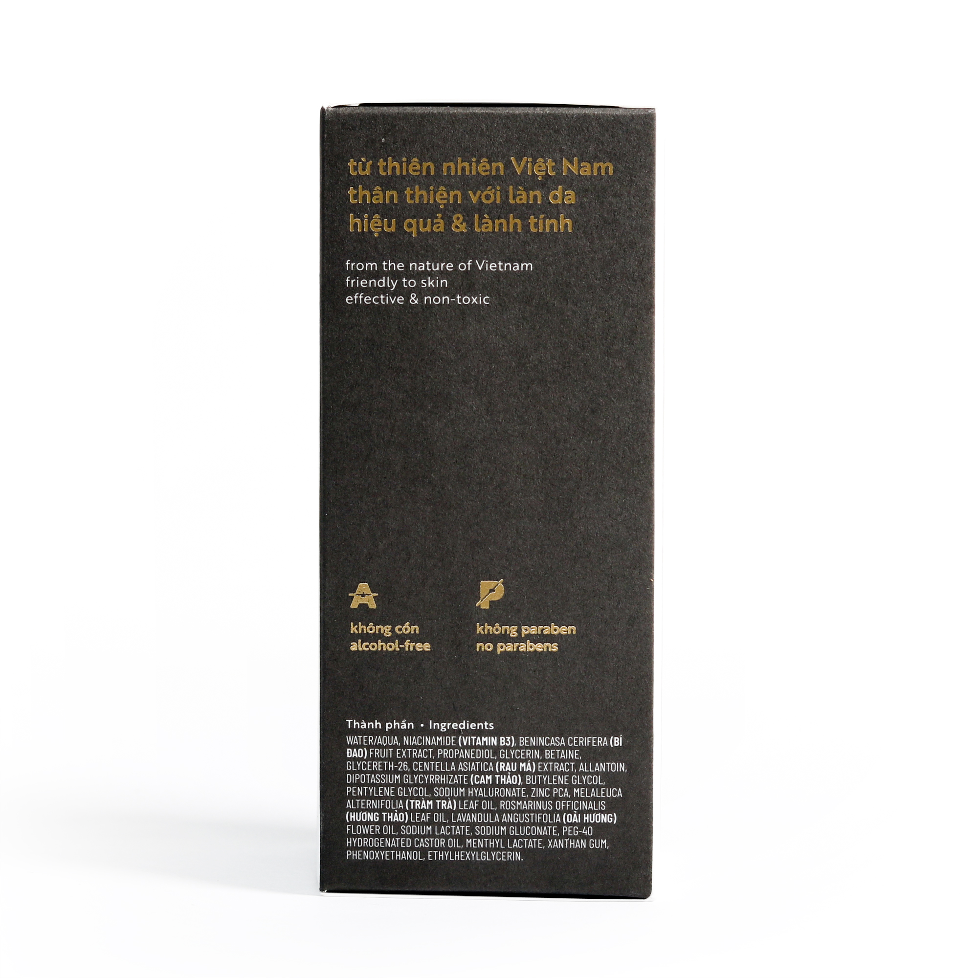 Water, Niacinamide (Vitamin B3), Benincasa Cerifera Fruit Extract (Bí đao), Propanediol, Glycerin, Betaine, Glycereth-26, Centella Asiatica Extract (Rau má), Allantoin, Dipotassium Glycyrrhizate (Cam thảo), Butylene Glycol, Pentylene Glycol, Sodium Hyaluronate (HA), Zinc Pca, Melaleuca Alternifolia Leaf Oil (Tràm trà), Rosmarinus Officinalis Leaf Oil (Hương thảo), Lavandula Angustifolia Flower Oil (Oải hương), Sodium Lactate, Sodium Gluconate, PEG-40 Hydrogenated Castor Oil, Menthyl Lactate, Xanthan gum, Phenoxyethanol, Ethylhexylglycerin.
