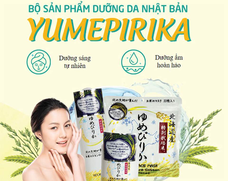 - Phù hợp với tất cả các loại da Bộ 3 sản phẩm Yumepirika còn 2 sản phẩm Mặt nạ gạo Yumepirika Face Mask (Gói 33 mặt nạ) và Gel dưỡng sáng da All In One Yumepirika CÁCH DÙNG Rửa mặt sạch sau đó dùng khăn thấm khô rồi thoa Nước dưỡng sáng da Yumepirika lên da, vỗ nhẹ nhàng cho đến khi thẩm thấu hoàn toàn. Cách sử dụng mặt nạ gạo Yumepirika hiệu quả