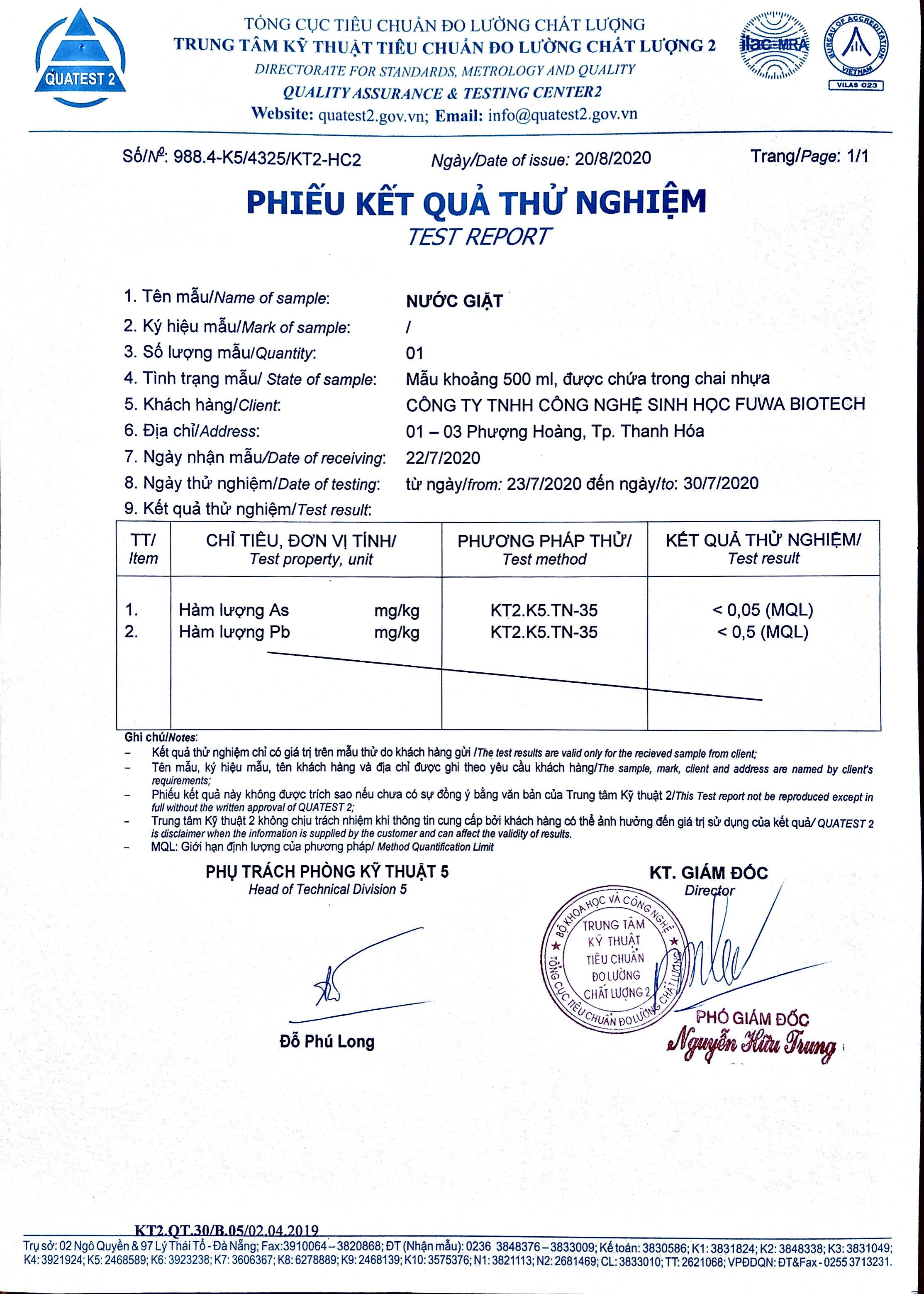 • Wastewater can clean sewers Usage: Dispense 60ml for 20-25 pieces of clothes Storage: Keep in a dry place, avoid direct sunlight & temperature < 45°C EXP: 18 months from the manufacturing date, 06 months after opening Notices: This product is less foamy than conventional chemical products Basic standards apply: TCCS006:2020/CSF Manufactured by: FUWA BIOTECH BIOTECHNOLOGY CO., LTD
