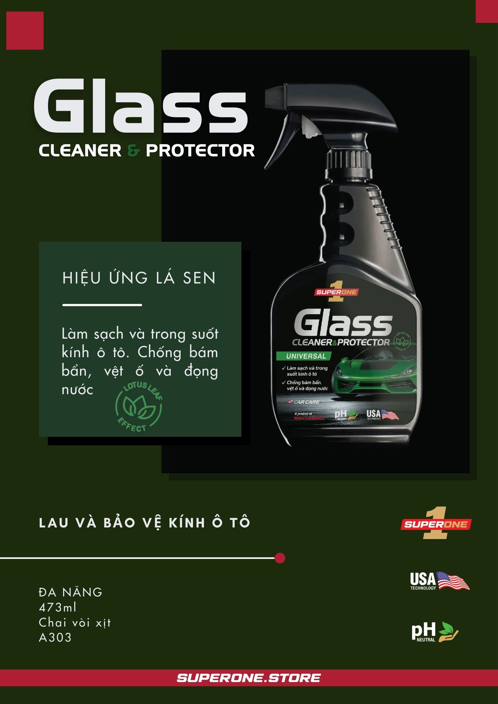 LÀM SẠCH VÀ TRONG SUỐT KÍNH Ô TÔ - CHỐNG BÁM BẨN, VỆT Ố VÀ ĐỌNG NƯỚC   Nước Lau Và Bảo Vệ Kính Super One Glass Cleaner and Protector - Universal, một